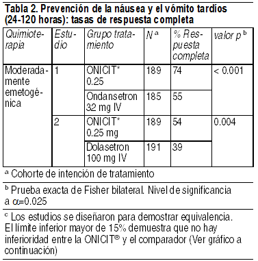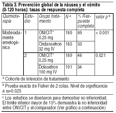 Estos estudios muestran que la Onicit es eficaz para la prevención de la náusea y el vómito agudos asociados con el curso inicial y los cursos repetidos de quimioterapia del cáncer, moderada y altamente emetogénica. En el estudio 3, la eficacia fue mayor cuando se administró terapia profiláctica concomitante de corticosteroides. No se ha demostrado adecuadamente la superioridad clínica de este compuesto sobre otros antagonistas del receptor 5-HT3 en la fase aguda.