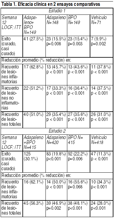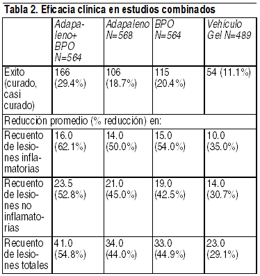 Ver TablaPropiedades farmacocinéticas: Las propiedades farmacocinéticas de Epiduo Gel son similares al perfil farmacocinético del gel de adapaleno al 0.1% solo. En un estudio farmacocinético de 30 días de exposición al Epiduo Gel o al gel de adapaleno al 0.1% conducido en pacientes con acné bajo condiciones maximizadas (con la aplicación de 2 g de gel por día), el adapaleno no fue cuantificable en la mayoría de las muestras plasmáticas (límite de cuantificación de 0.1 ng/ml). Se midieron niveles bajos de adapaleno (C