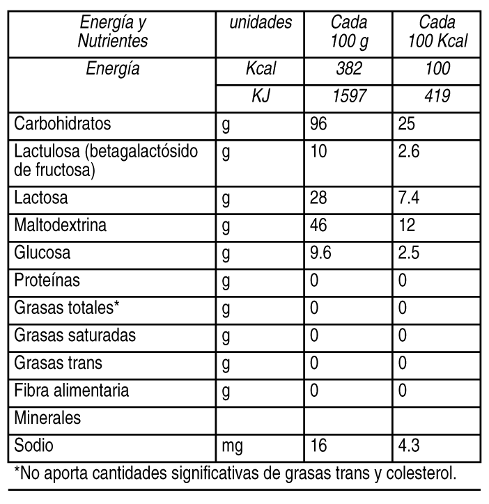 COMPOSICION: Ver Tabla Contiene: Maltodextrina, Lactosa, Lactulosa y Glucosa. Contiene derivados de leche. Puede contener derivados de pescado. DESCRIPCIONES: Alimento dietético para lactantes y niños en la primera infancia. Azúcar bifidogénico con lactulosa, libre de gluten. Sin TACC. INDICACIONES: Para normalizar la flora bacteriana y la función intestinal, constipación, hepatopatías descompensadas. DOSIS: Se recomienda incorporar de 5 a 10 g de producto por cada 100 g de alimento. Medida al ras: 5 g. PRESENTACIONES: Lata hermética por 500 g, con sistema easy-open y tapa plástica de seguridad. |