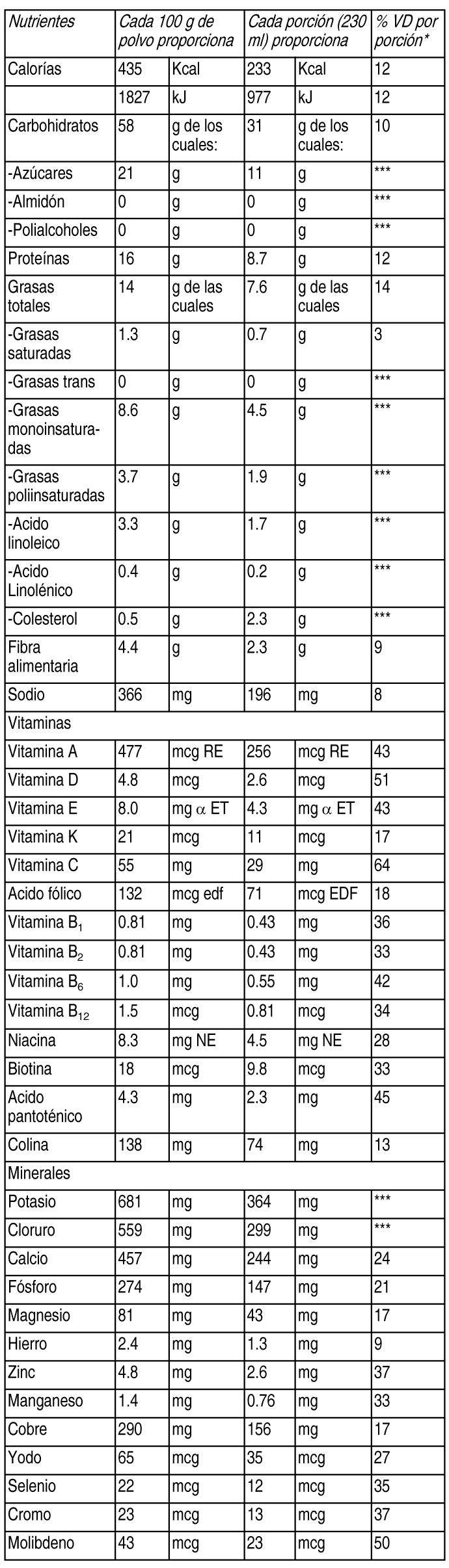 COMPOSICION: Ensure sabor a vainilla y a chocolate: Contiene: Almidón de Maíz Hidrolizado; Sacarosa; Aceites Vegetales (Aceite de Girasol de Alto Contenido Oleico; Aceite de Soja; Aceite de Canola); Caseinato de Calcio; Minerales (Citrato de Sodio; Fosfato Dibásico de Potasio; Cloruro de Magnesio; Carbonato de Calcio; Citrato de Potasio; Cloruro de Potasio; Cloruro de Sodio; Fosfato Monobásico de Sodio; Sulfato de Zinc; Sulfato Ferroso; Sulfato de Manganeso; Sulfato Cúprico; Cloruro de Cromo; Molibdato de Sodio; Ioduro de Potasio; Selenito de Sodio); Aislado de Proteína de Soja; Fructooligosacáridos; Inulina; Aislado de Proteínas de la Leche; Saborizante; Vitaminas: Cloruro de Colina; Ascorbato de Sodio; Vitamina E; Palmitato de Ascorbilo (antioxidante); Mezcla de Tocoferoles (antioxidante); Vitamina A Acetato; Niacinamida; d-Pantotenato de Calcio; Biotina; Vitamina D3; Cianocobalamina; Clorhidrato de Piridoxina; Clorhidrato de Tiamina; Acido Fólico; Riboflavina y Betacaroteno (antioxidante). Contiene Derivados de Leche y Derivados de Soja. Ver Tabla ACCION: Suplemento dietario en polvo para preparar bebida a base de carbohidratos, proteínas, lípidos, fibras, vitaminas y minerales, sabor a vainilla o chocolate. Libre de gluten. Sin T.A.C.C. INDICACIONES: Ensure está específicamente diseñado para proveer nutrición completa y balanceada y contiene nutrientes esenciales para colaborar con la salud. Ensure® es un suplemento nutricional completo y balanceado con una combinación de macro y micronutrientes (28 vitaminas y minerales, proteínas, fibras, carbohidratos y ácidos grasos), que ayudan a mantenerte saludable. Es fuente de fibra (FOS) y está formulado con antioxidantes (selenio y vitaminas C y E) y omega 3 y 6. No contiene grasas trans. DOSIS: Ingesta diaria y modo de uso: 1 porción aproximadamente de 230 ml o según consejo médico / nutricionista. Ensure® se prepara con agua. Para preparar 1 porción de 230 ml, vierta aproximadamente 195 ml de agua fría en un vaso, y añada gradualmente 6 cucharadas completas (cuchara incluida en la caja) o 53.8 g de Ensure®. Revuelva y agite bien para disolver el polvo. Si se mezcla como se indica, Ensure® proporciona 1.0 kcal/ml. CONSERVACION: Instrucciones para su almacenamiento: Almacene la caja sin abrir a temperatura ambiente. Una vez abierta la bolsa, doble la parte superior y guárdela dentro de la caja. Mantenga la cuchara limpia y seca fuera de la bolsa y cierre bien la caja. Una vez que la bolsa esté abierta, el contenido debe consumirse dentro de las 3 semanas. Una vez preparado debe consumirse con prontitud o cubrirse, guardarse en la heladera y usarse dentro de las 24 horas siguientes. PRESENTACIONES: Sabor chocolate: Envase conteniendo 400 g. Sabor vainilla: Envases conteniendo 400, 800 y 1200 g. |