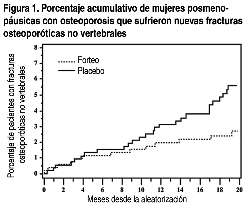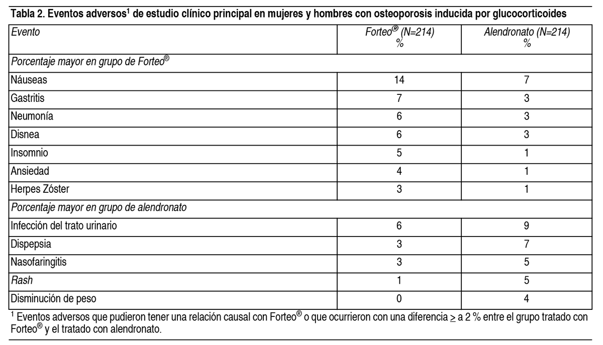 COMPOSICION: Cada dosis contiene: Teriparatida (origen ADN recombinante) 20 mcg. Cada ml contiene: Teriparatida (origen ADN recombinante) 250 mcg. Excipientes: Ácido Acético Glacial, Acetato de Sodio Anhidro, Manitol, Metacresol, Agua para Inyección c.s. Se pudo haber agregado ácido clorhídrico y/o hidróxido de sodio para ajustar el pH. DESCRIPCIONES: Teriparatida (rhPTH(1-34)) es idéntico a la secuencia de 34 aminoácidos N-terminal de la hormona paratiroidea humana endógena, y se la elabora utilizando tecnología de ADN recombinante. Forteo® (teriparatida) es una solución isotónica estéril, incolora, translúcida para inyección subcutánea que se presenta en cartucho de 2.4 ml contenido en un inyector (dispositivo) descartable. Este dispositivo libera 20 microgramos por dosis y contiene dosis para 28 días de tratamiento. ACCION: Hormonas paratiroideas y análogos. Código ATC: H05A. INDICACIONES: Forteo® (Teriparatida) está indicado para el tratamiento de la osteoporosis en mujeres posmenopáusicas con elevado riesgo de fractura y en las que presentan osteoporosis severa. Esto incluye mujeres con historia de fracturas osteoporóticas o quienes tienen múltiples factores de riesgo para fracturas o quienes no han respondido o son intolerantes al tratamiento osteoporótico convencional previo. Forteo® incrementa la densidad mineral ósea y reduce el riesgo de fracturas vertebrales y no vertebrales en mujeres posmenopáusicas con osteoporosis. Forteo® está indicado para aumentar la masa ósea en hombres con osteoporosis hipogonadal o primaria que tengan elevado riesgo de fractura, en los que presentan osteoporosis severa y en los que han fallado o son intolerantes a terapias osteoporóticas convencionales previas. Forteo® incrementa la densidad mineral ósea en hombres con osteoporosis hipogonadal o primaria. No se han estudiado los efectos de Forteo® en la reducción del riesgo de fracturas en hombres. Forteo® está indicado para el tratamiento de la osteoporosis asociada con una terapia sistémica mantenida con glucocorticoides en mujeres y hombres con un incremento en el riesgo de fractura. Forteo® no está indicado en pacientes pediátricos o en adultos jóvenes con epífisis abiertas. DOSIS: Tratamiento de la osteoporosis en mujeres posmenopáusicas con alto riesgo de fractura: La dosis recomendada es de 20 microgramos administrada por vía subcutánea 1 vez al día. Aumento de la masa ósea en hombres con osteoporosis hipogonadal o primaria de alto riesgo de fractura: La dosis recomendada es de 20 microgramos administrada por vía subcutánea 1 vez al día. Tratamiento de mujeres y hombres con osteoporosis inducida por glucocorticoides, con alto riesgo de fractura: La dosis recomendada es de 20 microgramos administrada por vía subcutánea 1 vez al día. Forteo® debe ser administrado como una inyección subcutánea en el muslo o la pared abdominal. No hay datos disponibles sobre la seguridad o eficacia sobre la administración de la inyección intravenosa o intramuscular de Forteo®. Forteo® debería administrarse inicialmente en el paciente sentado o acostado por si aparecen síntomas de hipotensión ortostática. Los medicamentos parenterales deben ser inspeccionados visualmente para detectar partículas y decoloración antes de su administración, cuando la solución y el envase lo permitan. Forteo® es un líquido transparente e incoloro. No use el producto si presenta partículas sólidas o si la solución está turbia o coloreada. Duración del tratamiento: La seguridad y eficacia del Forteo® no han sido evaluadas más allá de 2 años (24 meses) de tratamiento. En consecuencia, no se recomienda el uso del medicamento durante más de 2 años (24 meses). El ciclo de 24 meses de tratamiento con Forteo® no debe de repetirse a lo largo de la vida del paciente. Los pacientes deben recibir suplementos de calcio y vitamina D si el aporte dietético no es suficiente. Después de suspender el tratamiento con teriparatida, los pacientes pueden continuar con otros tratamientos contra la osteoporosis. Se debe enseñar a los pacientes el uso de técnicas de inyección correctas. Por favor, remítase al Manual del Usuario para instrucciones de uso del dispositivo. CONTRAINDICACIONES: Forteo® no deberá ser utilizado en pacientes con hipersensibilidad a teriparatida o a cualquiera de sus excipientes. Forteo® también está contraindicado en pacientes con hipercalcemia preexistente, con insuficiencia renal severa, en aquellos que hayan recibido anteriormente radioterapia sobre el esqueleto, que tengan elevaciones inexplicadas de la fosfatasa alcalina, y en aquellos con enfermedades óseas metabólicas distintas a la osteoporosis primaria (enfermedad de Paget, Hiperpartiroidismo-ver sección Advertencias y precauciones de uso especiales) u osteoporosis inducida por glucocorticoides. Pacientes con tumores óseos o metástasis óseas deben ser excluidos del tratamiento con Forteo®. ADVERTENCIAS: Riesgo potencial de osteosarcoma: Consulte la sección Advertencias y Precauciones Especiales de Uso del prospecto para ver la información completa. Los estudios en ratas indicaron que teriparatida causó un aumento en la incidencia de osteosarcoma, un tumor óseo maligno. Debido a la relevancia incierta que puedan tener en humanos los hallazgos de osteosarcoma en ratas, Forteo® debe ser administrado solo a pacientes para quienes los potenciales beneficios superen los potenciales riesgos. Forteo® no debe administrarse a pacientes que tienen riesgo basal incrementado para osteosarcoma (por ejemplo, aquellos con enfermedad de Paget o elevaciones inexplicables de fosfatasa alcalina, pacientes pediátricos o adultos jóvenes con epífisis abiertas, o con radioterapia externa previa o con radioterapia con implantes que comprometan el esqueleto). Úsese solo por indicación y bajo supervisión médica. Osteosarcoma: Los estudios en ratas indicaron que teriparatida causó un aume