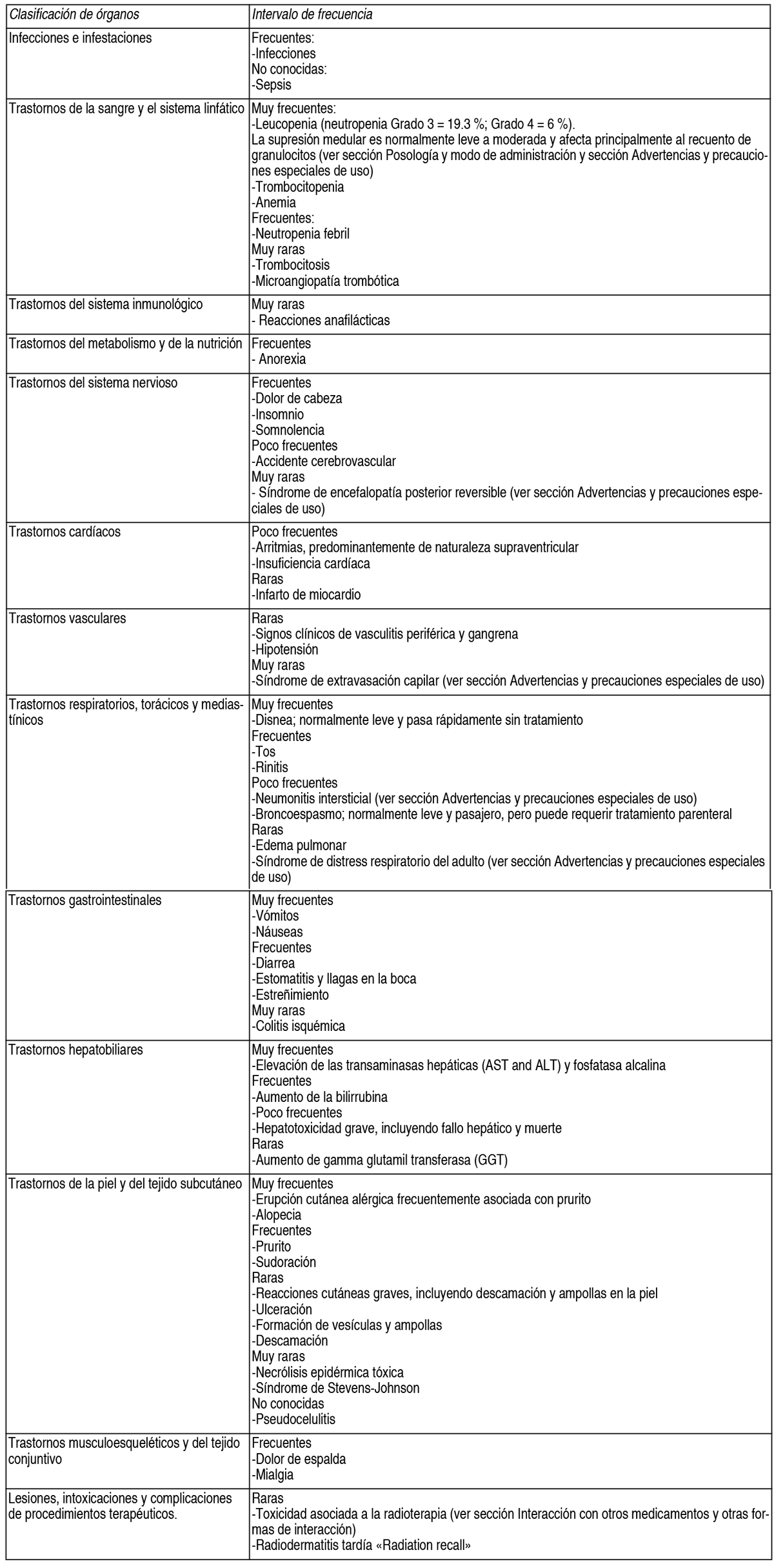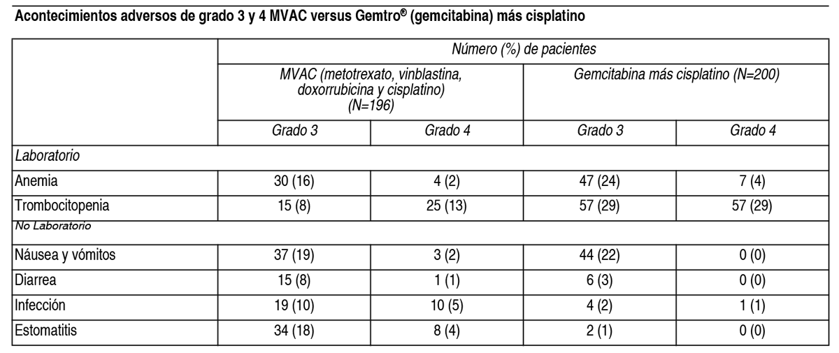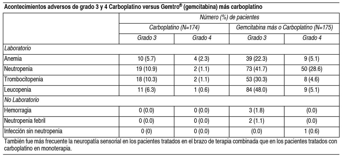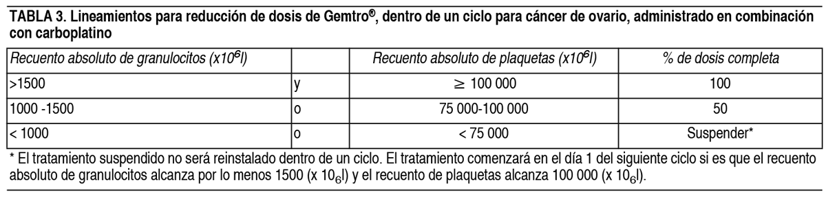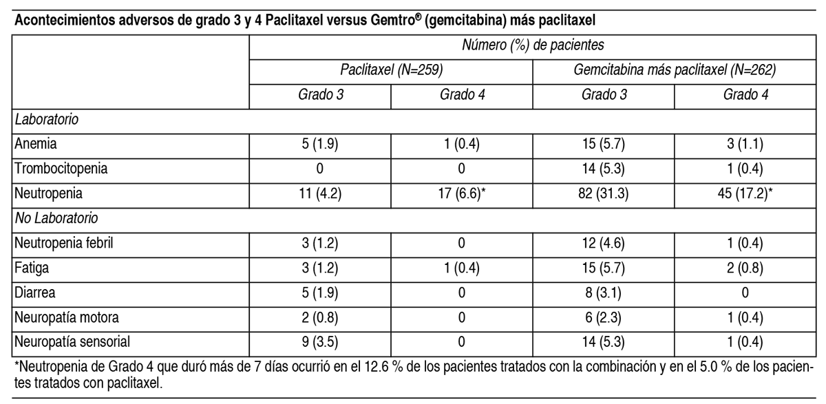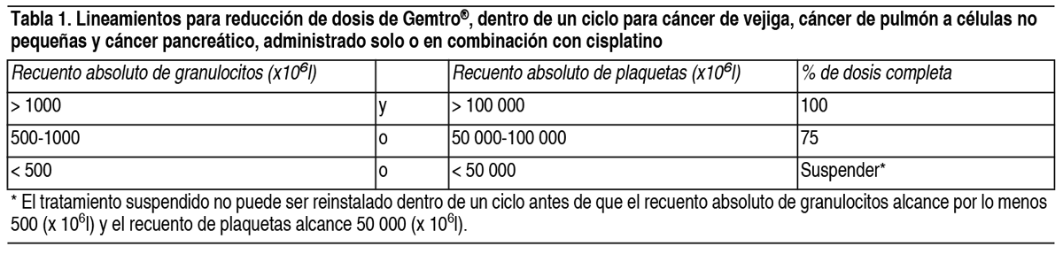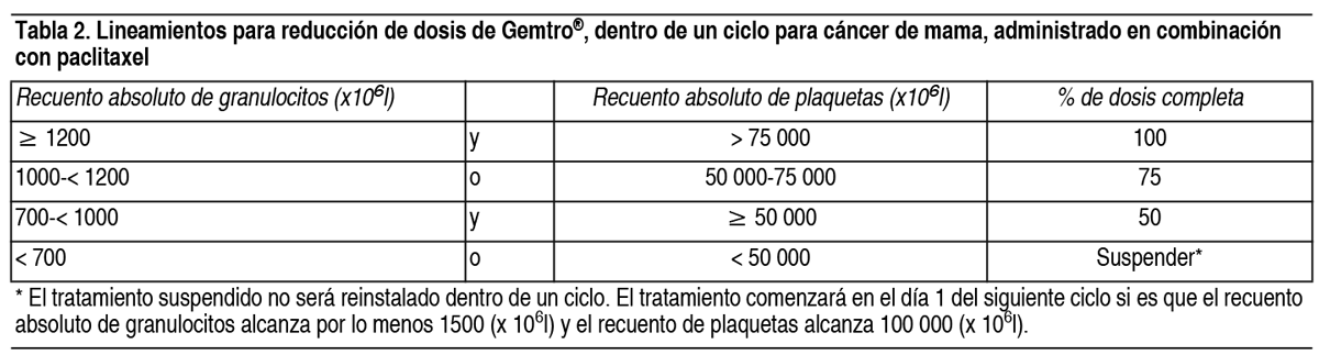 COMPOSICION: Gemtro® 200 mg: Cada frasco ampolla contiene: Gemcitabina (como clorhidrato) 200 mg, Manitol 200 mg, Acetato de Sodio 12.50 mg, Gemtro® 1 g: Cada frasco ampolla contiene: Gemcitabina (como clorhidrato) 1.00 g, Manitol 1.00 g, Acetato de Sodio 62.50 mg, Ácido clorhídrico y/o hidróxido de sodio pueden haber sido agregados para el ajuste del pH. ACCION: Oncolítico. Grupo farmacoterapéutico: Análogos de pirimidina. Código ATC: L01BC05. INDICACIONES: Cáncer de vejiga: Gemtro® en combinación con cisplatino está indicado para el tratamiento de pacientes con cáncer de vejiga localmente avanzado o metastásico. Cáncer de páncreas: Gemtro® está indicado para el tratamiento de pacientes con adenocarcinoma pancreático localmente avanzado o metastásico. Cáncer pulmonar de células no-pequeñas: Gemtro® está indicado en combinación con cisplatino como tratamiento de primera línea en pacientes con cáncer pulmonar a células no pequeñas localmente avanzado o metastásico. Gemtro® como monoterapia puede ser considerado en pacientes en edad avanzada o en aquellos con evolución en estado 2. Cáncer de ovario: Gemtro® en combinación con carboplatino está indicado para el tratamiento de pacientes con carcinoma epitelial ovárico localmente avanzado o metastásico en pacientes que han recaído después de un mínimo de 6 meses de finalizada una terapia de primera línea basada en platinos. Cáncer de mama: Gemtro® en combinación con paclitaxel está indicado para el tratamiento de pacientes con cáncer de mama con recurrencia local o metastásico, no resecable, que han recaído después de quimioterapia adyuvante/neoadyuvante. La quimioterapia previa debe haber incluido una antraciclina a menos que estuviera clínicamente contraindicada. DOSIS: Cáncer de vejiga: Gemtro® en combinación con cisplatino: La dosis recomendada de Gemtro® es de 1000 mg/m2, administrada mediante perfusión intravenosa de 30 minutos. Esta dosis debe darse los días 1, 8 y 15 de un ciclo de 28 días en combinación con cisplatino. El cisplatino es administrado a una dosis recomendada de 70 mg/m2 en el día 1, seguido de Gemtro® o en el día 2 de cada ciclo de 28 días. Este ciclo de 4 semanas debe luego repetirse. La reducción de la dosis en cada ciclo o dentro de un ciclo se aplica basándose en el grado de toxicidad experimentada por el paciente. Cáncer pancreático: La dosis recomendada de Gemtro® es de 1000 mg/m2, administrada mediante perfusión intravenosa de 30 minutos. Esto debe repetirse 1 vez a la semana por hasta 7 semanas seguido de 1 semana de descanso. Los ciclos posteriores deberán consistir en inyecciones 1 vez a la semana durante 3 de cada 4 semanas consecutivas. La reducción de la dosis en cada ciclo o dentro de un ciclo se aplica basándose en el grado de toxicidad experimentada por el paciente. Cáncer de pulmón de células no pequeñas: Gemtro® solo: La dosis recomendada de Gemtro® es de 1000 mg/m2, administrada mediante perfusión intravenosa de 30 minutos. Esto debe repetirse 1 vez a la semana durante 3 semanas, seguido por un período de descanso de 1 semana. Luego se repite este ciclo de 4 semanas. La reducción de la dosis en cada ciclo o dentro de un ciclo se aplica basándose en el grado de toxicidad experimentada por el paciente. Gemtro® en combinación con cisplatino: La dosis recomendada de Gemtro® es 1250 mg/m2 de superficie corporal, administrada mediante perfusión intravenosa de 30 minutos en los días 1 y 8 de cada ciclo de 21 días de tratamiento. La reducción de la dosis en cada ciclo o dentro de un ciclo se aplica basándose en el grado de toxicidad experimentada por el paciente. El cisplatino ha sido usado en dosis entre 75 y 100 mg/m2 1 vez cada 3 semanas. Cáncer de mama: Gemtro® en combinación con paclitaxel: La dosis recomendada de Gemtro® en combinación con paclitaxel es: paclitaxel (175 mg/m2) administrado en el día 1 como perfusión intravenosa en aproximadamente 3 horas, seguida de Gemtro® (1250 mg/m2) administrada como una perfusión intravenosa de 30 minutos en los días 1 y 8 de cada ciclo de 21 días. La dosis en cada ciclo o dentro de un mismo ciclo se puede reducir en función de la toxicidad experimentada por el paciente. Los pacientes deben tener un recuento absoluto de granulocitos de por lo menos 1.500 (x106/l) antes de iniciar un nuevo ciclo de Gemtro® en combinación con paclitaxel. Cáncer de ovario: Gemtro® en combinación con carboplatino: Se recomienda administrar la siguiente combinación de gemcitabina y carboplatino: Gemtro® 1000 mg/m2 mediante perfusión intravenosa de 30 minutos, en los días 1 y 8 de cada ciclo de 21 días. El carboplatino será administrado en el día 1, después de la administración de Gemtro®, en una dosis consistente con el objetivo del área bajo la curva (ABC) de 4.0 mg/ml-min. La reducción de la dosificación en cada ciclo o dentro de un ciclo se aplica basándose en el grado de toxicidad experimentado por el paciente. Monitoreo y ajuste de dosis debido a toxicidad no hematológica: Deberán realizarse exámenes físicos y chequeos periódicos de las funciones hepática y renal para detectar toxicidad no hematológica. La reducción de la dosis en cada ciclo o dentro de un ciclo se aplicará de acuerdo al grado de toxicidad experimentada por el paciente. En general; en casos de toxicidad no hematológica severa (Grados 3 o 4), excepto si se trata de náuseas/vómitos, la terapia con Gemtro® debe suspenderse o disminuirse dependiendo del criterio del médico tratante. La dosificación debe ser suspendida hasta que la toxicidad sea resuelta según la opinión del médico tratante. Para ajuste de dosis de cisplatino, carboplatino y paclitaxel en terapias combinadas, vea el inserto de su fabricante. Ajuste de dosis debido a toxicidad hematológica: Al iniciar un ciclo: En todas las indicaciones, los pacientes que reciben Gemtro® deberán ser monitoreados antes de cada dos