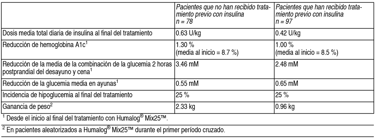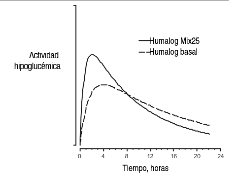 COMPOSICION: Cada ml de Humalog® Mix25TM contiene: Insulina Lispro 25 U, Insulina Lispro protamina 75 U. Excipientes (fosfato dibásico de sodio, glicerol, fenol, metacresol, sulfato de protamina, óxido de zinc y agua para inyectables) c.s.p. 1.0 ml. Durante la elaboración, se puede haber agregado solución de hidróxido de sodio al 10 % o solución de ácido clorhídrico al 10 % para ajustar el pH. Cada dispositivo contiene 3 ml. La insulina lispro se obtiene por tecnología de ADN recombinante de Escherichia coli. DESCRIPCIONES: Humalog® Mix25TM y Humalog® Mix50TM es una suspensión blanca y estéril. ACCION: Humalog® Mix25TM y Humalog® Mix5TM: Son una premezcla en suspensión de insulina lispro (análogo de insulina humana de acción rápida) y suspensión de insulina lispro protamina (análogo de insulina humana de acción intermedia). Código ATC: A10AD04. INDICACIONES: Humalog® Mix25TM y Humalog® Mix50TM: Están indicados para el tratamiento de los pacientes con diabetes mellitus que requieren insulina para el mantenimiento de la homeostasia normal de la glucosa. DOSIS: La dosis debe ser determinada por el médico, según los requerimientos del paciente. Humalog® Mix25TM y Humalog® Mix50TM pueden ser administrados poco antes de las comidas. Cuando sea necesario pueden ser administrados poco después de las comidas. Humalog® Mix25TM y Humalog ® Mix50TM: Humalog® Mix25TM y Humalog® Mix50TM solo se pueden administrar por inyección subcutánea. No se deben administrar Humalog® Mix25TM y Humalog® Mix50TM por vía intravenosa bajo ninguna circunstancia. La administración subcutánea debe realizarse en la zona superior de los brazos, muslos, nalgas o abdomen. La utilización de estas zonas de inyección debe alternarse, de tal forma que un mismo lugar de inyección no sea utilizado aproximadamente más de 1 vez al mes. Hay que tomar precauciones cuando se inyecte Humalog® Mix25TM o Humalog® Mix50TM por vía subcutánea para tener la seguridad de no haber penetrado un vaso sanguíneo. Después de la inyección, no se debe realizar masaje de la zona de inyección. Se debe enseñar a los pacientes las técnicas de inyección adecuadas. Tras la administración de Humalog® Mix25TM o Humalog® Mix50TM por vía subcutánea, se observa un comienzo de acción rápido y un pico temprano de actividad similar al de Humalog®. Esto permite administrar Humalog® Mix25TM o Humalog® Mix50TM muy próximo a una comida. La duración de acción de la suspensión de insulina lispro protamina (BASAL), componente de Humalog® Mix25TM y Humalog® Mix50TM, es similar al de la insulina basal (NPH). El perfil de acción de cualquier insulina puede variar considerablemente entre diferentes personas o en diferentes momentos dentro de una misma persona. Como sucede con todos los preparados de insulina, la duración de los efectos de Humalog® Mix25TM y Humalog® Mix50TM depende de la dosis, lugar de inyección, perfusión sanguínea, temperatura y del ejercicio físico. CONTRAINDICACIONES: Humalog® Mix25TM y Humalog® Mix50TM están contraindicadas durante episodios de hipoglucemia. Humalog® Mix25TM y Humalog® Mix50TM están contraindicadas en pacientes con hipersensibilidad a insulina lispro o a cualquiera de los excipientes que se encuentran en la formulación. ADVERTENCIAS: Humalog® Mix25TM y Humalog® Mix50TM no se deben administrar por vía intravenosa en ninguna circunstancia. Nunca se deben compartir Humalog KwikPen entre pacientes. Nunca se deben compartir Humalog KwikPen, entre pacientes, inclusive si se cambia la aguja. Compartir estos dispositivos implica un riesgo de transmisión de agentes patógenos transportados por la sangre. La decisión de modificar el tipo o marca de insulina administrada a un paciente, debe tomarse bajo estricta supervisión médica. Los cambios en la concentración, nombre comercial (fabricante), tipo (regular, NPH, lenta, etc.), especie (animal, humana, análogo de insulina humana), y/o método de fabricación (técnicas de ADN recombinante versus insulina de origen animal) pueden dar lugar a la necesidad de un cambio en la dosis. Para insulinas de acción rápida, cualquier paciente que también esté en tratamiento con una insulina basal, debe ajustar la dosis de ambas insulinas para obtener un control glucémico adecuado a lo largo del día, especialmente de la glucemia nocturna y en ayunas. Entre las circunstancias que pueden hacer que los síntomas tempranos de alarma de hipoglucemia sean diferentes o menos pronunciados se puede citar la diabetes de larga duración, el tratamiento intensivo con insulina, las enfermedades nerviosas asociadas a la diabetes o los medicamentos, como por ej., betabloqueadores. Algunos pacientes que han experimentado reacciones hipoglucémicas tras el cambio de insulina animal a insulina humana comunicaron que los síntomas tempranos de alarma de hipoglucemia fueron menos pronunciados o diferentes de los que experimentaban con su insulina previa. La falta de corrección de las reacciones hipoglucémicas o hiperglucémicas puede ser causa de pérdida de conciencia, coma o muerte. El uso de dosis que no sean adecuadas o la interrupción del tratamiento, especialmente en diabéticos insulinodependientes, puede producir hiperglucemia y cetoacidosis; estas situaciones pueden ser potencialmente letales. Los requerimientos de insulina pueden disminuir en presencia de deterioro renal. Los requerimientos de insulina pueden disminuir en pacientes con deterioro hepático producido tanto por reducción de la capacidad de glucogénesis como por reducción de la degradación de insulina. Sin embargo, en pacientes con deterioro hepático crónico, un aumento de la resistencia insulínica puede dar lugar a un incremento de los requerimientos insulínicos. Los requerimientos de insulina pueden aumentar durante una enfermedad o por alteraciones emocionales. También puede ser necesario un ajuste de la dosis de insulina si los pacientes au