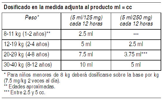 COMPOSICION: Iset 125 mg/5 ml: Cada 5 ml de suspensión reconstituida contiene: Claritromicina 125 mg. Excipientes c.s. Iset 250 mg/5 ml: Cada 5 ml de suspensión reconstituida contiene: Claritromicina 250 mg. Excipientes c.s. ACCION: Antibiótico macrólido semi-sintético. INDICACIONES: Tratamiento de infecciones leves a moderadas producidas por cepas susceptibles de los siguientes microorganismos: Adultos: Faringitis y amigdalitis: por S. pyogenes (la droga de elección en el tratamiento y prevención de infecciones estreptocóccicas y en la profilaxis de la fiebre reumática, es la penicilina, por vía oral o I.M.). La claritromicina generalmente es efectiva en la erradicación de S. pyogenes de la nasofaringe; sin embargo, no hay datos para establecer la eficacia de la claritromicina en la prevención de fiebre reumática. Sinusitis maxilar aguda: causada por H. influenzae, M. catarrhalis o S. pneumoniae. Exacerbación aguda bacteriana de la bronquitis crónica: causada por H. influenzae, M. catarrhalis, o S. pneumoniae. Neumonía: producida por M. pneumoniae o S. pneumoniae. Infecciones no complicadas de piel y faneras: debidas a S. aureus o S. pyogenes (los abscesos habitualmente requieren drenaje quirúrgico). Infecciones micobacterianas diseminadas: producidas por M. avium o M. intracellulare. DOSIS: Preparación de la suspensión: agregar agua potable hasta la flecha; agitar hasta lograr una suspensión uniforme. Reagregar agua hasta alcanzar nuevamente el nivel señalado por la flecha. Agitar. Gránulos para suspensión oral: el producto está indicado en niños a partir de los 6 meses de edad. La duración usual del tratamiento es de 5 a 10 días dependiendo del agente etiológico y de la severidad de la enfermedad. La dosis diaria de Iset suspensión pediátrica (125 mg/5 ml) es de 7.5 mg/kg 2 veces al día hasta una dosis máxima de 500 mg/día para infecciones no micobacterianas. La duración del tratamiento para faringitis estreptocócica deberá ser como mínimo de 10 días. La suspensión reconstituida puede ser tomada con o alejada de las comidas. Puede ingerirse con leche. En la siguiente Tabla hay una guía sugerida para determinar la dosificación: Ver Tabla CONTRAINDICACIONES: Hipersensibilidad conocida a los antibióticos macrólidos. Como la dosis no puede ser reducida a menos de 500 mg/día, la claritromicina de liberación modificada está contraindicada en pacientes con depuración de creatinina menor de 30 ml/min. También está contraindicada en pacientes que reciben tratamiento simultáneo con terfenadina, cisapride y pimozida. PRESENTACIONES: Iset 125 mg/5 ml: Envase con polvo para reconstituir 60 ml de suspensión. Iset 250 mg/5 ml: Envases con polvo para reconstituir 60 y 100 ml de suspensión. |