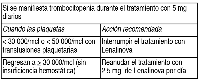 COMPOSICION: Lenalinova 5 mg: Cada cápsula dura contiene: Lenalidomida 5.00 mg, Lactosa Anhidra 147.00 mg, Celulosa Microcristalina 40.00 mg, Croscarmelosa Sódica 6.00 mg, Estearato de Magnesio 2.00 mg, Colorante FD&C Amarillo Nº6 0.00073200 mg, Colorante D&C Amarillo Nº10 (amarillo de quinoleína) 0.02928000 mg, Dióxido de Titanio 0.3832752 mg, Gelatina csp 100 %. Lenalinova 10 mg: Cada cápsula dura contiene: Lenalidomida 10.00 mg, Lactosa Anhidra 294.00 mg, Celulosa Microcristalina 80.00 mg, Croscarmelosa Sódica 12.00 mg, Estearato de Magnesio 4.00 mg, Colorante Azul Brillante FD&C N°1 0.00236680 mg, Colorante Rojo FD&C N°40 0.00388000 mg, Colorante Amarillo FDEC N° 6 0.00310200 mg, Colorante Carmoisina (azorrubina) 0.15520000 mg, Dióxido de Titanio 0.6094704 mg, Gelatina csp 100 %. Lenalinova 15 mg: Cada cápsula dura contiene: Lenalidomida 15.00 mg, Lactosa Anhidra 289.00 mg, Celulosa Microcristalina 80.00 mg, Croscarmelosa Sódica 12.00 mg, Estearato de Magnesio 4.00 mg, Colorante Azul Brillante FD&C N° 1 0.01358000 mg, Colorante Carmoisina (azorrubina) 0.00232800 mg, Dióxido de Titanio 0.64271424 mg, Gelatina csp 100 %. Lenalinova 25 mg: Cada cápsula dura contiene: Lenalidomida 25.00 mg, Lactosa Anhidra 200.00 mg, Celulosa Microcristalina 159.00 mg, Croscarmelosa Sódica 12.00 mg, Estearato de Magnesio 4.00 mg, Colorante FD&C Azul N°1 (azul brillante) 0.04656000 mg, Colorante D&C Amarillo N°10 (amarillo de quinoleína) 0.05432000 mg, Colorante FD&C Amarillo N°6 (amarillo 6) 0.00232800 mg, Dióxido de Titanio 0.6371736 mg, Gelatina csp 100 %. ACCION: Inmunomodulador. Código ATC: LO4AX04. INDICACIONES: Síndrome mielodisplásico (SMD): Lenalinova en monoterapia está indicado para el tratamiento de pacientes adultos con anemia dependiente de transfusión debido a síndromes mielodisplásicos de riesgo bajo o intermedio-1 vinculados a una anormalidad citogenética de deleción 5q aislada con o sin anormalidades citogenéticas adicionales cuando otras opciones terapéuticas son insuficientes o inadecuadas. Mieloma múltiple (MM): Lenalinova en monoterapia está indicado en el tratamiento de mantenimiento de pacientes adultos con mieloma múltiple de nuevo diagnóstico que se han sometido a un trasplante autólogo de células madre. Lenalinova en terapia combinada con dexametasona, o bortezomib y dexametasona, o melfalán y prednisona (ver «Posología y forma de administración») está indicado para el tratamiento de pacientes adultos con mieloma múltiple (MM) sin tratamiento previo que no son candidatos para un trasplante. Lenalinova en combinación con dexametasona está indicado para el tratamiento de pacientes con mieloma múltiple que hayan recibido al menos un tratamiento previo. Linfoma de células del manto (LCM): Lenalinova en monoterapia está indicado para el tratamiento de pacientes adultos con linfoma de células del manto (LCM) que han sufrido recaída o progresión de la enfermedad luego de recibir 2 terapias previas, en una de las cuales se haya utilizado bortezomib. Linfoma folicular: Lenalinova en combinación con rituximab (anticuerpo anti-CD20) está indicado para el tratamiento de pacientes adultos que han recibido tratamiento previo para el linfoma folicular (grado 1-3a). DOSIS: Lenalinova debe ingerirse por vía oral a la misma hora todos los días, con o sin alimentos. Las cápsulas de Lenalinova se deben ingerir con agua y tragarlas enteras. No abrir, partir ni masticar las cápsulas. Mieloma múltiple: La dosis inicial recomendada de Lenalinova es de 25 mg/día, en los días 1-21 de ciclos repetidos de 28 días en combinación con dexametasona. La dosis recomendada de dexametasona en pacientes con diagnóstico reciente es de 40 mg/día, única dosis, en los días 1, 8, 15 y 22 de cada ciclo de 28 días, con reducción de la dosis a 20 mg/día en pacientes mayores de 75 años. La dosis recomendada de dexametasona en pacientes con tratamiento previo es de 40 mg/día, administrados por vía oral en 1 toma, en los días 1 a 4, 9 a 12 y 17 a 20 de cada ciclo de 28 días por los primeros 4 ciclos de terapia. La dosis es reducida a 40 mg/día, administrados vía oral en 1 toma, en los días 1 a 4 de cada ciclo de 28 días, luego de los primeros 4 ciclos de terapia. El tratamiento debe continuarse hasta la progresión de la enfermedad o la aparición de efectos tóxicos inaceptables. En pacientes no aptos para un trasplante autólogo de células madre, el tratamiento debe continuar hasta la progresión de Ia enfermedad o la aparición de efectos tóxicos inaceptables. En pacientes aptos para trasplante autólogo de células madre, la movilización de células madre hematopoyéticas debe ocurrir dentro de 4 ciclos del tratamiento con Lenalinova. Ajustes de dosis para toxicidades hematológicas durante el tratamiento de mieloma múltiple: Se recomiendan los lineamientos de modificación de dosis, tal como se resumen a continuación, para manejar la neutropenia o trombocitopenia grado 3 o 4 u otra toxicidad grado 3 o 4 que se considere en relación con la lenalidomida. Ver Tabla Otras toxicidades en mieloma múltiple: Para otras toxicidades grados 3 o 4 que se consideran relacionadas con Lenalinova, continuar el tratamiento y reiniciar según el criterio del médico, en el próximo nivel de dosis más baja cuando se resuelva la toxicidad a ≥ grado 2. Ajuste de dosis inicial para insuficiencia renal en mieloma múltiple: Ver «Dosis inicial en pacientes con insuficiencia renal en MM, SMD y LCM». Síndrome mielodisplásico: La dosis inicial recomendada de Lenalinova es 10 mg diarios. El tratamiento puede o no modificarse en base a hallazgos clínicos y de laboratorio. Ajustes de dosis para toxicidades hematológicas durante el tratamiento de SMD: Los pacientes que reciben una dosis inicial de 10 mg y que experimentan trombocitopenia deben tener un ajuste de dosis de la siguiente manera: Ver Tabla Los pacientes que experimentan trombocitopenia con una