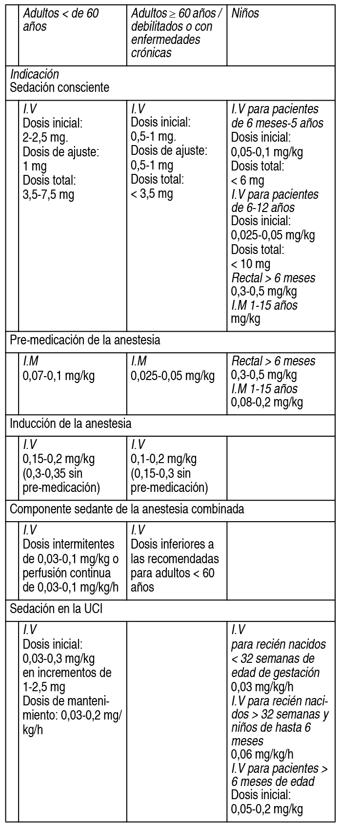 COMPOSICION: Comprimidos 7.5 mg: Cada comprimido contiene: Midazolam (como maleato) 7.5 mg. Comprimidos 15 mg: Cada comprimido contiene: Midazolam (como maleato) 15 mg. Inyectable 5 mg: Cada 5 ml de solución inyectable contiene: Midazolam (como clorhidrato) 5 mg. Inyectable 15 mg: Cada 3 ml de solución inyectable contiene: Midazolam (como clorhidrato) 15 mg. ACCION: Hipnoinductor. INDICACIONES: Adultos: Sedación consciente antes y durante procedimientos diagnósticos o terapéuticos con o sin anestesia local. Anestesia: Premedicación antes de la inducción de la anestesia. Inducción de la anestesia. Como componente sedante en la anestesia combinada. Sedación en unidades de cuidados intensivos. Niños: Sedación consciente antes y durante procedimientos diagnósticos o terapéuticos con o sin anestesia local. Anestesia: Premedicación antes de la inducción de la anestesia. Sedación en unidades de cuidados intensivos. DOSIS: El producto es un potente agente sedante que requiere una administración lenta e individualización de la dosis. La experiencia clínica ha demostrado que el producto es 3 a 4 veces tan potente por mg como diazepam. Dado que han sido informadas reacciones adversas cardiorrespiratorias serias y que comprometían la vida del paciente, deben tomarse recaudos para el control, la detección y la corrección de estas reacciones para todo paciente que reciba el producto, independientemente de la edad o el estado de salud. Dosis simples altas o la administración I.V. rápida puede resultar en depresión respiratoria, obstrucción y/o depresión de las vías respiratorias. El potencial de estos últimos efectos se ve aumentado en pacientes debilitados, aquellos que reciben medicaciones concomitantes capaces de deprimir el SNC, y en pacientes sin un tubo endotraqueal que estén siendo sometidos a un procedimiento que involucre las vías respiratorias superiores como endoscopía. En la tabla siguiente se muestran las dosis habituales: Ver Tabla Posología para la sedación consciente: Para la sedación consciente antes de una intervención diagnóstica o quirúrgica se administrará midazolam por vía I.V. La dosis debe individualizarse y adaptarse, y no debe administrarse en una inyección rápida en una sola embolada. El inicio de la sedación puede variar individualmente según el estado físico del paciente y las circunstancias detalladas en la posología (p.ej. velocidad administración, cantidad de dosis). Si es necesario, pueden administrarse dosis posteriores con arreglo a las necesidades individuales. El medicamento empieza a actuar aproximadamente 2 minutos después de la inyección. Se obtiene un efecto máximo en un plazo de 5 a 10 minutos. Adultos: La inyección IV de midazolam debe administrarse con lentitud a una velocidad de aproximadamente 1 mg en 30 segundos. En el caso de los adultos menores de 60 años, la dosis inicial es de 2 a 2.5 mg, administrada 5 a 10 minutos antes de comenzar el procedimiento. Puede administrarse más dosis de 1 mg según las necesidades. Se ha observado que las dosis totales medias varían entre 3.5 y 7.5 mg. No suele ser necesaria una dosis total mayor de 5 mg. En el caso de los adultos de más de 60 años y los pacientes debilitados o con enfermedades crónicas se debe empezar administrando una dosis de 0.5 a 1 mg. Pueden administrarse más dosis de 0.5 a 1 mg según las necesidades. Habitualmente, no es necesaria una dosis total superior a 3.5 mg. Niños: Administración I.V: la dosis de midazolam debe ajustarse con lentitud hasta obtener el efecto clínico deseado. La dosis inicial de midazolam debe administrarse durante 2 ó 3 minutos. Se deben esperar de 2 a 5 minutos más para comprobar con exactitud el efecto sedante antes de iniciar el procedimiento o repetir la dosis. Si se necesita más sedación, hay que continuar ajustando la posología con pequeños incrementos hasta conseguir el grado de sedación apropiado. Los lactantes y los niños menores de 5 años pueden necesitar dosis considerablemente mayores (mg/kg) que los niños mayores y los adolescentes. Pacientes pediátricos menores de 6 meses: los niños menores de 6 meses son particularmente vulnerables a la obstrucción de las vías respiratorias y la hipoventilación. Por este motivo, no se recomienda el uso para sedación consciente en los niños menores de 6 meses. Pacientes pediátricos de 6 meses a 5 años de edad: dosis inicial de 0.05 a 0.1 mg/kg. Puede ser necesaria una dosis total de hasta 0.6 mg/kg para conseguir la sedación deseada, pero la dosis total no debe exceder de 6 mg. Las dosis superiores pueden asociarse con sedación prolongada y riesgo de hipoventilación. Pacientes pediátricos de 6 a 12 años: dosis inicial de 0.025 a 0.05 mg/kg. Puede ser necesaria una dosis total de hasta 0.4 mg/kg que no exceda de 10 mg. Las dosis superiores pueden asociarse con sedación prolongada y riesgo de hipoventilación. Pacientes de 12 a 16 años: la dosis debe ser la misma que para los adultos. Administración rectal: la dosis total de midazolam suele variar entre 0.3 y 0.5 mg/kg. La administración rectal de la solución de la ampolla se realiza mediante un aplicador de plástico fijado en el extremo de la jeringa. Si el volumen que se ha de administrar es demasiado pequeño, se puede añadir agua hasta un volumen total de 10 ml. La dosis total debe administrarse de una vez, y hay que evitar la administración rectal repetida. No se recomienda el uso para niños menores de 6 meses, pues apenas se dispone de datos de esta población. Administración I.M: las dosis empleadas varían entre 0.05 y 0.15 mg/kg. Habitualmente, no es necesaria una dosis total superior a 10,0 mg. Esta vía sólo se debe utilizar en casos excepcionales. Es preferible la administración rectal, pues la inyección I.M es dolorosa. En el caso de los niños que pesen menos de 15 kg no se recomiendan las soluciones de midazolam con concentraciones mayores de 1 mg/ml. Las concentracion