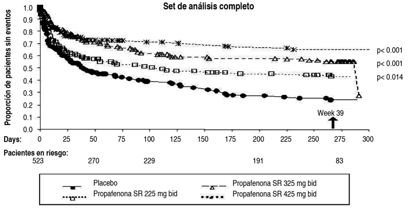 COMPOSICION: Normorytmin XR 225: Cada cápsula de liberación prolongada contiene 225 mg de Clorhidrato de Propafenona, Hipromelosa 2910 7.20 mg, Estearato de Magnesio 1.80 mg, Agua Purificada c.s.p. Contenido de la cápsula: Gelatina 74.3888 mg, Dióxido de Titanio E171 1.520 mg, Laurilsulfato de Sodio 0.152 mg. Composición de la tinta de impresión para la cápsula (trazas): Óxidos e Hidróxidos Férricos E 172 (óxido férrico rojo), Shellac, Propilenglicol, Hidróxido de Potasio. Normorytmin XR 325: Cada cápsula de liberación prolongada contiene 325 mg de Clorhidrato de Propafenona, Hipromelosa 2910 10.40 mg, Estearato de Magnesio 2.60 mg, Agua Purificada c.s.p. Contenido de la cápsula: Gelatina 96.04 mg, Dióxido de Titanio E171 1.96 mg, Laurilsulfato de Sodio 0.196 mg. Composición de la tinta de impresión para cápsula (trazas): Óxidos e Hidróxidos Férricos, E 172 (óxido férrico rojo), Shellac, Propilenglicol, Hidróxido de Potasio. Normorytmin XR 425: Cada cápsula de liberación prolongada contiene 425 mg de Clorhidrato de Propafenona, Hipromelosa 2910 13.60 mg, Estearato de Magnesio 3.40 mg, Agua Purificada c.s.p. Contenido de la cápsula: Gelatina 103.88 mg, Dióxido de Titanio E171 2.12 mg, Laurilsulfato de Sodio 0.212 mg. Composición de la tinta de impresión para la cápsula: Óxidos e Hidróxidos Férricos, E 172 (óxido férrico rojo), Shellac, Propilenglicol, Hidróxido de Potasio. ACCION: Código ATC: C01BC03. Antiarrítmico con algunas similitudes estructurales de los agentes betabloqueantes. INDICACIONES: Normorytmin XR (liberación sostenida/prolongada) está indicado para prolongar el tiempo hasta la recurrencia de arritmias auriculares sintomáticas en pacientes sin insuficiencia cardíaca estructural significativa y con una historia de fibrilación auricular sintomática. DOSIS: La dosis de Normorytmin XR deberá ser ajustada individualmente sobre la base de respuesta y tolerancia. El ajuste de la dosis de mantenimiento individual deberá estar supervisado por un cardiólogo (registros repetidos de ECG y mediciones de presión sanguínea). Se recomienda que el tratamiento sea iniciado con 225 mg de clorhidrato de propafenona (como cápsulas de liberación prolongada) administrados cada 12 horas. La dosis puede ser incrementada a un intervalo mínimo de 5 días a 325 mg de clorhidrato de propafenona (como cápsulas de liberación prolongada) administradas cada 12 horas. Si se requiere un efecto terapéutico adicional, la dosis de clorhidrato de propafenona (como cápsulas de liberación prolongada) puede ser incrementada a 425 mg administrados cada 12 horas luego de un mínimo de otro intervalo de 5 días. Para facilitar el ajuste de la dosis, están disponibles concentraciones adicionales de propafenona SR. La comparación directa de cápsulas SR de propafenona con cápsulas de propafenona IR (liberación inmediata/instantánea) no ha sido estudiada en los ensayos clínicos. En aquellos pacientes en los cuales se produce un engrosamiento significativo del complejo QRS o bloqueo auriculoventricular de segundo o tercer grado, se deberá considerar una reducción de la dosis. Población pediátrica: Normorytmin XR no ha sido estudiado en niños y adolescentes. Pacientes de edad avanzada: No se observaron diferencias en general en seguridad y eficacia en esta población de pacientes, sin embargo, la sensibilidad de algunos individuos mayores no pude ser descartada, de allí que estos pacientes deberán ser monitoreados cuidadosamente. El ajuste de dosis deberá ser realizado con especial precaución en estos pacientes. Insuficiencia renal: La eliminación del metabolito principal de la propafenona es afectada por la insuficiencia renal, de allí que Normorytmin XR debe ser administrado cuidadosamente. Insuficiencia hepática: La propafenona es metabolizada extensivamente a través de un pasaje de oxidasa hepática saturable. En vista de la biodisponibilidad incrementada y la eliminación de la vida media de propafenona, puede ser necesaria una reducción en la dosis recomendada. Método de administración: Normorytmin XR deberá ser ingerido con líquido, tanto antes como después de las comidas. No aplastar o separar los contenidos de la cápsula. CONTRAINDICACIONES: Hipersensibilidad al principio activo o a cualquiera de los excipientes. Síndrome de Brugada conocido. Enfermedad cardíaca estructural significativa como: incidente de infarto de miocardio dentro de los últimos 3 meses. Insuficiencia cardíaca congestiva no controlada donde la fracción de eyección del ventrículo izquierdo es menor al 35 % Shock cardiogénico, a menos que esté causado por arritmia. Bradicardia sintomática grave. Presencia de disfunción del nódulo sinusal, defectos de la conducción auricular, bloqueo auriculoventricular de segundo grado o mayor, bloqueo de rama o bloqueo distal en ausencia de un marcapasos artificial. Hipotensión severa. Trastornos manifiestos del equilibrio electrolítico (por ej., trastornos del metabolismo de potasio). Enfermedad pulmonar obstructiva severa. Miastenia gravis. Tratamiento concomitante con ritonavir. EFECTOS: Las reacciones adversas más frecuentes y muy comunes relacionadas con la terapia con Normorytmin XR son mareos, trastornos de la conducción cardíaca y palpitaciones. Resumen del perfil de seguridad: La tabla siguiente muestra las reacciones adversas referidas durante los ensayos clínicos y en la experiencia poscomercialización con Normorytmin XR cápsulas duras de liberación prolongada. Reacciones de estudios clínicos o de la vigilancia poscomercialización: Las reacciones consideradas al menos posiblemente relacionadas con Normorytmin XR se muestran por grupo sistémico y frecuencia utilizando la siguiente convención: Muy común (2:1/10), común (2:1/100 a < 1/10), no común (2:1/1000 a < 1/100) y desconocida (reacciones adversas de la experiencia poscomercialización; no pueden ser estimadas a partir de los datos dis