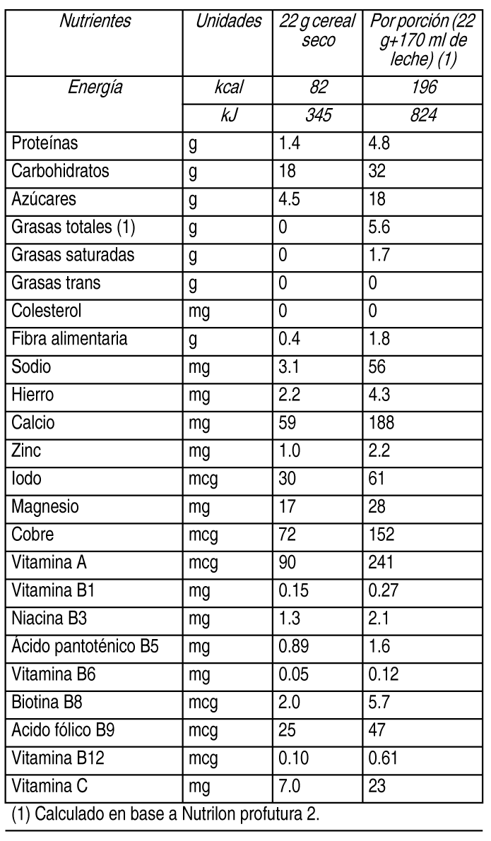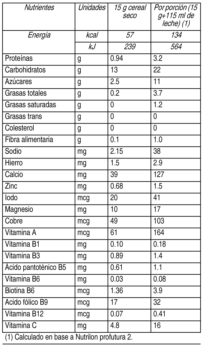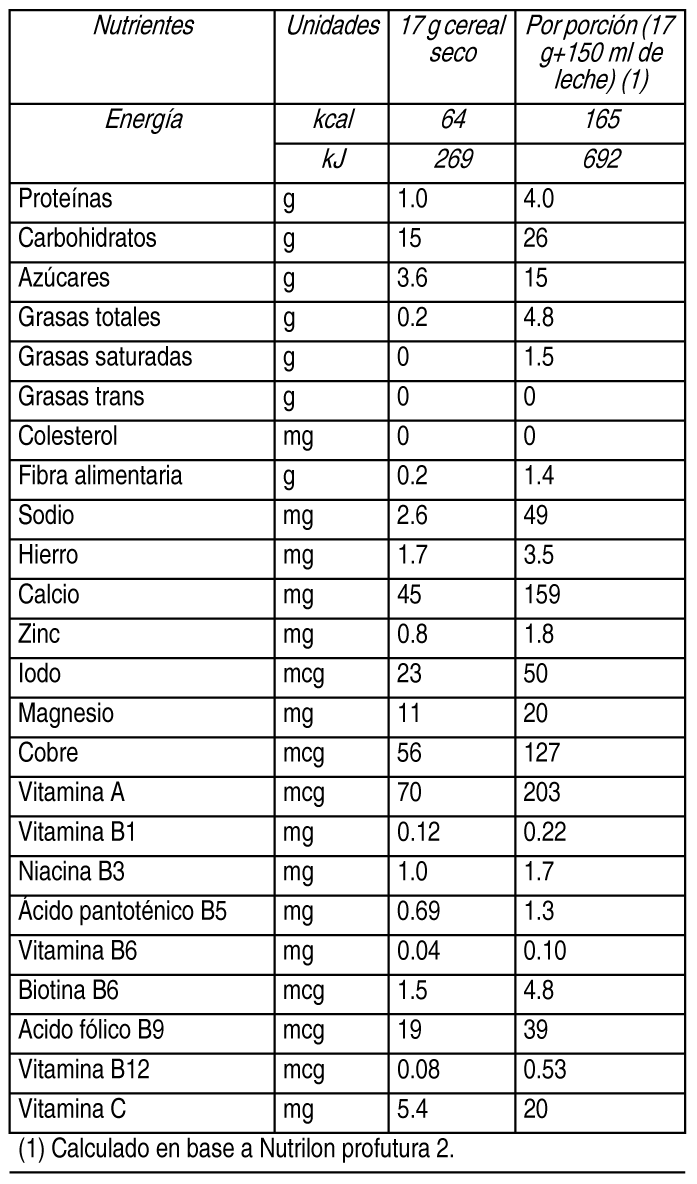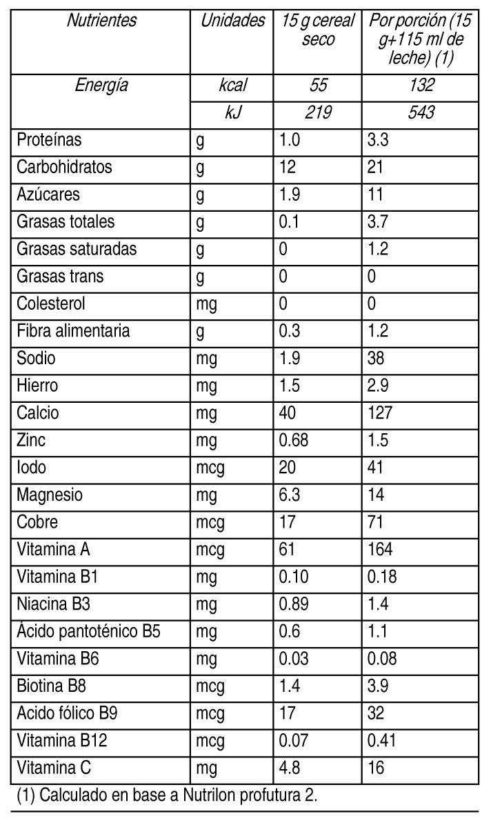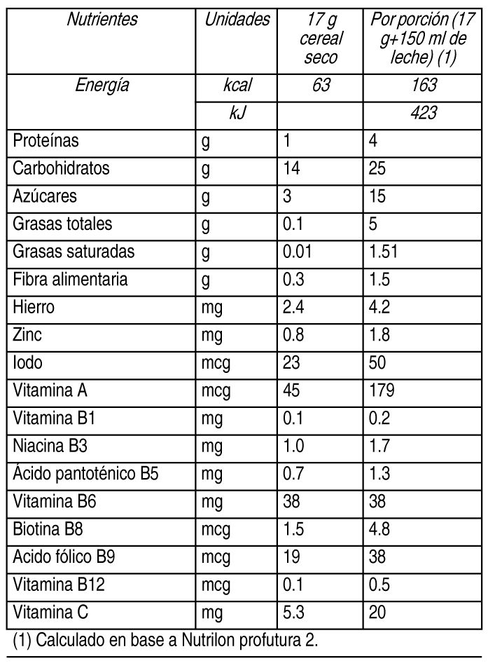 COMPOSICION: Arroz: Información nutricional: Ver Tabla Contiene: Harina de Arroz, Azúcar, Maltodextrina, Fosfato Tricálcico, Ácido Ascórbico, Óxido de Magnesio, Pirofosfato Férrico, Sulfato de Zinc, Niacinamida, Acetato de Vitamina A, Pantotenato de Calcio, Ioduro de Potasio, Mononitrato de Tiamina, Biotina, Piridoxina, Ácido Fólico, Sulfato de Cobre, Vitamina B12, Sabor Vainilla Artificial en Polvo. Banana y manzana: Información nutricional: Ver Tabla Contiene: Harina de Arroz, Azúcar, Banana Deshidratada en Escamas, Manzana Deshidratada en Escamas, Maltodextrina, Fosfato Tricálcico, Ácido Ascórbico, Óxido de Magnesio, Pirofosfato Férrico, Sulfato de Zinc, Niacinamida, Acetato de Vitamina A, Pantotenato de Calcio, Ioduro de Potasio, Mononitrato de Tiamina, Biotina, Piridoxina, Ácido Fólico, Sulfato de Cobre, Vitamina B12, Sabor Vainilla Artificial en Polvo. Ciruela: Información nutricional: Ver Tabla Contiene: Harina de Arroz, Azúcar, Harina de Avena, Extracto de Malta, Banana Deshidratada en Escamas, Ciruela Deshidratada en Escamas, Maltodextrina, Fosfato Tricálcico, Ácido Ascórbico, Óxido de Magnesio, Pirofosfato Férrico, Sulfato de Zinc, Niacinamida, Acetato de Vitamina A, Pantotenato de Calcio, Ioduro de Potasio, Mononitrato de Tiamina, Biotina, Piridoxina, Ácido Fólico, Sulfato de Cobre, Vitamina B12, Sabor Vainilla Artificial en Polvo. Maíz: Información nutricional: Ver Tabla Contiene: Harina de Maíz, Azúcar, Maltodextrina, Fosfato Tricálcico, Ácido Ascórbico, Óxido de Magnesio, Pirofosfato Férrico, Sulfato de Zinc, Niacinamida, Acetato de Vitamina A, Pantotenato de Calcio, Ioduro de Potasio, Mononitrato de Tiamina, Biotina, Piridoxina, Ácido Fólico, Sulfato de Cobre, Vitamina B12, Sabor Vainilla Artificial en Polvo. 5 cereales: Información nutricional: Ver Tabla Contiene: Harina de Trigo, Azúcar, Harina de Arroz, Harina de Maíz, Harina de Avena, Maltodextrina de Maíz, Harina Cebada, Fosfato Tricálcico, Ácido Ascórbico, Óxido de Magnesio, Pirofosfato Férrico, Sulfato de Zinc, Niacinamida, Pantotenato de Calcio, Vitamina A, Ioduro de Potasio, Mononitrato de Tiamina, Biotina, Piridoxina, Sulfato de Cobre, Ácido Fólico, Vitamina B12, Sabor Vainilla en Polvo, Sabor Vainilla Natural Líquido. ACCION: Alimento complementario a partir de los 6 meses. INDICACIONES: Para la alimentación complementaria a partir del 6 mes de vida. PRESENTACIONES: Envase plástico conteniendo de 200 g. |