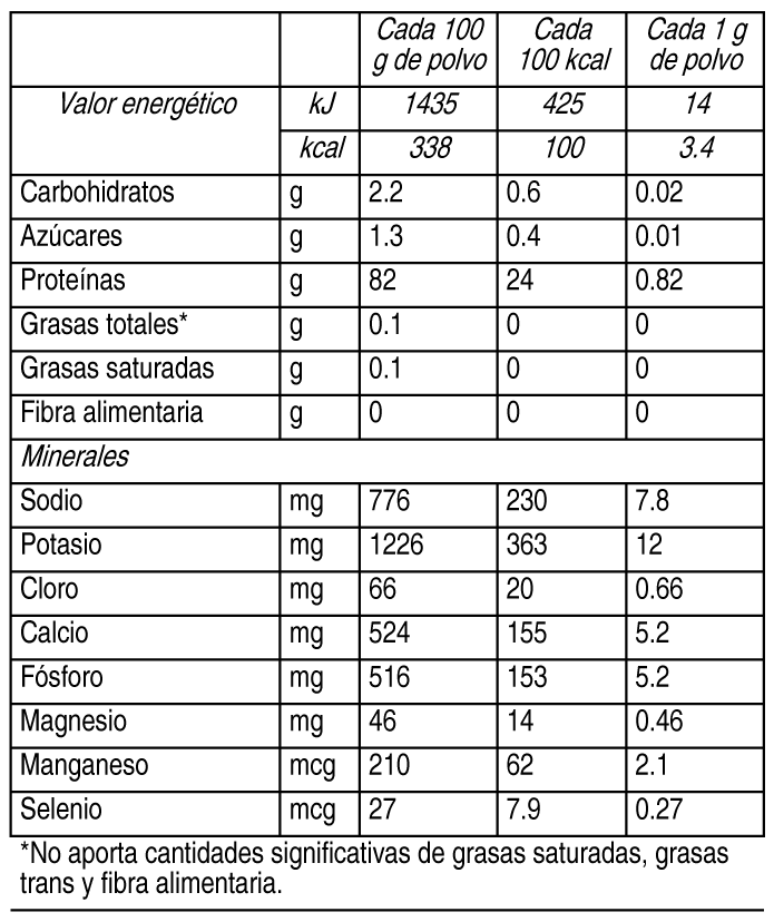 COMPOSICION: Ver Tabla Contiene: Proteína de Suero Hidrolizada, Caseína Hidrolizada. Contiene Derivados de Leche. DESCRIPCIONES: Suplemento dietario de proteínas lácteas hidrolizadas, para lactantes de bajo peso al nacer, en sobres. Libre de gluten. Sin TACC. ACCION: Suplemento dietario. INDICACIONES: Para lactantes de bajo peso al nacer. DOSIS: El suplemento proteico debe añadirse a la leche materna a la que se ha añadido un fortificador o a una fórmula para prematuros para alcanzar el nivel de proteínas que cubra las necesidades de los lactantes de muy bajo peso, a fin de asegurar un crecimiento y desarrollo adecuados. La ingesta proteica recomendada para bebés prematuros de menos de 1000 g debe ser de 3.6-4.1 g/100 kcal (4-4.5 g/kg/día). (1). (1) Según recomendación de ESPGHAN 2010. Si se utiliza con la leche materna: Si es posible, medir el contenido de proteína de la leche materna * y agregar el fortificador de acuerdo con las instrucciones. Añadir la cantidad adecuada de suplemento proteico para alcanzar el nivel de proteínas recomendado de 3.6-4.1g/100 kcal. Se recomienda medir el nivel de nitrógeno ureico en sangre. * Si no se analiza el nivel de proteínas de la leche materna, por favor utilice el nivel de proteínas promedio en la leche materna o la leche humana pretérmino y añada el suplemento de proteína. Si se utiliza con una fórmula para prematuros: Nutrilon prematuros 1 contiene 3.3 g/proteína/100 kcal (2.6 g/100 ml). Para ajustar el nivel proteico de modo de alcanzar la recomendación para recién nacidos de bajo peso al nacer con necesidades de proteínas no cubiertas por una fórmula estándar, se adiciona 1 sobre (conteniendo 1 g de suplemento)/100 ml de leche humana o de fórmula para prematuros para lograr cubrir los extras de necesidades proteicas. Debe considerarse el nivel proteico de la leche humana o de la fórmula o evaluar un método de balance para el control de la ingesta. El suplemento contiene 82% de proteínas, por lo que al agregar 1 g de suplemento, se agregan 0.82 g de proteína. Se recomienda medir el nivel de nitrógeno ureico en sangre. |