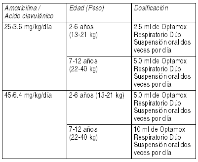 COMPOSICION: Cada dosis de polvo para preparar 5 ml de suspensión contiene: Amoxicilina (como Amoxicilina trihidrato) 400 mg; Acido Clavulánico (como clavulanato de Potasio) 57 mg; Ambroxol Clorhidrato 15 mg. Excipientes: Goma Xantana; Aspartame; Acido Succínico; Dióxido de Silicio Coloidal; Hidroxipropilmetilcelulosa; Esencia de Naranja; Esencia de Frambuesa, Silicagel. ACCION: Antibiótico de amplio espectro (código ATC J01C R02). Mucolítico. Expectorante. INDICACIONES: Optamox Respiratorio Duo se administra 2 veces al día y está indicado para el tratamiento a corto plazo de las siguientes infecciones respiratorias bacterianas causadas por microorganismos productores de ß-lactamasas resistentes a la amoxicilina, que cursen con alteración de las secreciones de las vías respiratorias. En otras circunstancias, se deberá considerar la administración de amoxicilina sola. Infecciones del tracto respiratorio superior (incluyendo nariz, garganta y oído) en particular, tonsilitis recurrente, sinusitis, otitis media. Estas infecciones son frecuentemente ocasionadas por Streptococcus pneumoniae, Haemophilus influenzae*, Moraxella catarrhalis* y Streptococcus pyogenes. Infecciones del tracto respiratorio inferior, en particular exacerbaciones agudas de bronquitis crónica (especialmente si se considera severa), bronconeumonía. Estas infecciones son frecuentemente ocasionadas por Streptococcus pneumoniae, Haemophilus influenzae* y Moraxella catarrhalis*. Más adelante se presenta una lista con los microorganismos susceptibles (ver Propiedades farmacológicas). *Algunos miembros de estas especies de bacterias producen ß-lactamasas, resultando insensibles a la amoxicilina por separado. Las infecciones mixtas causadas por organismos sensibles a la amoxicilina y organismos productores de ß-lactamasas sensibles a la combinación amoxicilina - ácido clavulánico pueden ser tratadas con Optamox Respiratorio Duo. Estas infecciones no requerirán de la adición de otro antibiótico. DOSIS: La dosis usual diaria recomendada de Optamox Respiratorio Dúo expresada en amoxicilina / ácido clavulánico es: - 25 / 3.6 mg / kg / día en infecciones leves a moderadas (infecciones del aparato respiratorio superior como tonsilitis recurrente y del aparato respiratorio inferior). - 45 / 6.4 mg / kg / día para el tratamiento de infecciones más severas (infecciones del aparato respiratorio superior como otitis media y sinusitis, infecciones del aparato respiratorio inferior como bronconeumonía). Los cuadros siguientes sirven de guía para la administración en niños. Niños mayores de 2 años: Ver Tabla Niños con función renal inmadura: En niños con función renal inmadura no se recomienda el uso de Optamox Respiratorio Dúo. Insuficiencia renal: En niños con una tasa de filtración glomerular (TFG) > 30 ml/minuto no se requiere ajuste de la dosificación. En niños con TFG < 30 l/minuto no se recomienda el uso de Optamox Respiratorio Dúo. Insuficiencia hepática: Dosificar con precaución; monitorear la función hepática a intervalos regulares. No existe hasta el momento suficiente evidencia como para establecer una recomendación de dosificación. CONTRAINDICACIONES: Optamox Respiratorio Dúo está contraindicado en pacientes con antecedentes de hipersensibilidad a las penicilinas y al ambroxol. Debe prestarse atención a una posible sensibilidad cruzada con otros antibióticos betalactámicos, como las cefalosporinas. Antecedentes de ictericia / disfunción hepática asociadas a la penicilina o a la administración de amoxicilina y ácido clavulánico. ADVERTENCIAS: Antes de iniciar el tratamiento con Optamox Respiratorio Dúo, se debe hacer un interrogatorio minucioso acerca de antecedentes de reacciones de hipersensibilidad a las penicilinas, cefalosporinas u otros alergenos. Se han observado cambios en pruebas de la función hepática en algunos pacientes tratados con la asociación de amoxicilina y ácido clavulánico. La importancia clínica de estos cambios es incierta, pero aun así Optamox Respiratorio Dúo debe administrarse con precaución en pacientes con evidencia de disfunción hepática. En raras oportunidades se observó ictericia colestásica, la cual puede ser severa pero generalmente es reversible. Los signos y los síntomas pueden no ser aparentes hasta 6 semanas después de finalizado el tratamiento. En pacientes con insuficiencia renal moderada o severa, no se recomienda el uso de Optamox Respiratorio Dúo. Se han registrado reacciones de hipersensibilidad (anafilactoides) severas y ocasionalmente fatales en pacientes tratados con penicilinas. Estas reacciones son más probables en individuos con antecedentes de hipersensibilidad a la penicilina. Se han observado erupciones eritematosas asociadas a mononucleosis infecciosa en pacientes tratados con amoxicilina. El uso prolongado también puede llevar ocasionalmente a una proliferación excesiva de organismos no sensibles. Se recomienda administrar con precaución a pacientes con antecedentes de úlcera péptica. Se ha reportado colitis pseudomembranosa, que puede variar entre leve a severa, por lo que es importante considerar este diagnóstico en pacientes que presentan diarrea subsecuente a la administración del medicamento. Optamox Respiratorio Dúo contiene 12.5 mg de aspartame por dosis de 5 ml, por lo tanto deben tomarse recaudos en caso de fenilcetonuria. Embarazo: Los estudios de reproducción en animales (ratones y ratas) con la asociación de amoxicilina y ácido clavulánico administrada por vía oral y parenteral no evidenciaron efectos teratogénicos. No existe experiencia suficiente con Optamox Respiratorio Dúo en mujeres embarazadas, por tal motivo su uso no está recomendado en el embarazo. Lactancia: No existe experiencia suficiente con Optamox Respiratorio Dúo durante la lactancia, por tal motivo su uso no está recomendado. EFECTOS: Las experiencias adversas son infrecuentes y principalmente de nat
