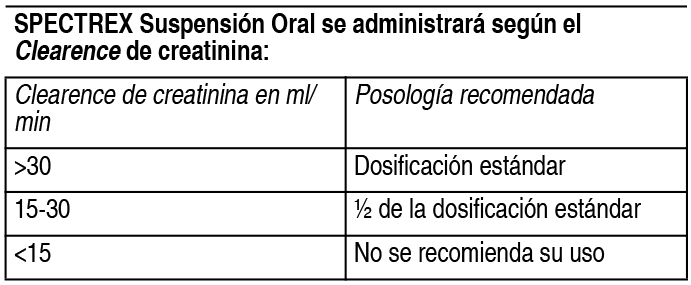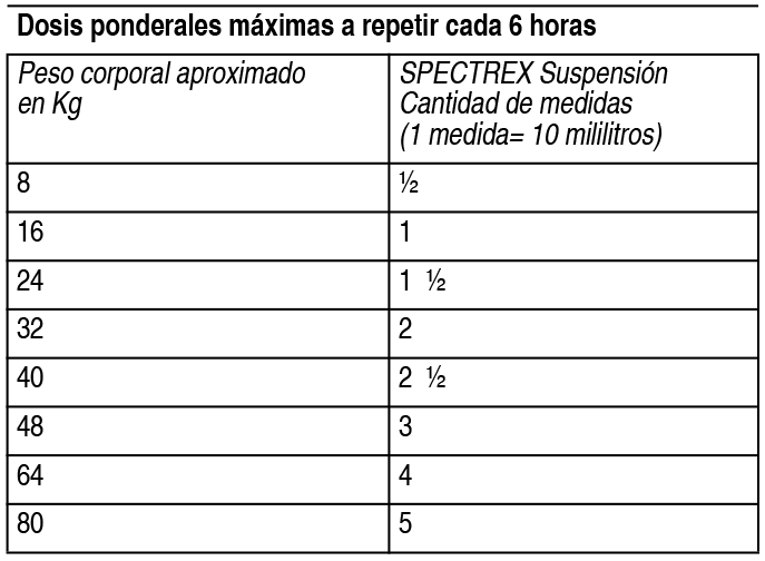 COMPOSICION: Suspensión Oral: Cada 5 ml contiene: Trimetoprima 40 mg; Sulfametoxazol 200 mg. Inyectable I.V.: Ampolla I.V. monodosis de 5 ml: Cada ampolla contiene: Trimetoprima 80 mg; Sulfametoxazol 400 mg. Frasco-ampolla I.V. de 5 ml: Cada frasco-ampolla contiene: Trimetoprima 80 mg; Sulfametoxazol 400 mg. Frasco-ampolla I.V. de 10 ml: Cada frasco-ampolla contiene: Trimetoprima 160 mg; Sulfametoxazol 800 mg. Frasco-ampolla I.V. Multidosis de 30 ml: Cada frasco-ampolla contiene: Trimetoprima 480 mg; Sulfametoxazol 2.400 mg. Ampolla I.M. de 3 ml: Cada ampolla contiene: Trimetoprima 160 mg; Sulfametoxazol 800 mg. Ampolla I.M. Forte de 4.5 ml: Cada ampolla contiene: Trimetoprima 240 mg; Sulfametoxazol 1.200 mg. Ampolla I.M. Pediátrico de 1.5 ml: Cada ampolla contiene: Trimetoprima 80 mg; Sulfametoxazol 400 mg. Comprimidos: Cada comprimido pediátrico contiene: Trimetoprima 20 mg; Sulfametoxazol 100 mg. Cada comprimido adulto contiene: Trimetoprima 80 mg; Sulfametoxazol 400 mg. Cada comprimido Forte contiene: Trimetoprima 160 mg; Sulfametoxazol 800 mg. ACCION: Agente quimioterápico, bactericida, antiinfeccioso de amplio espectro. INDICACIONES: Suspensión Oral: Infecciones del tracto urinario causadas por Escherichia coli, Klebsiella species, Enterobacter species, Morganella morganii, Proteus mirabilis y Proteus vulgaris. Otitis media aguda en niños debido a cepas susceptibles de Streptococcus pneumoniae o Haemophilus influenzae cuando a juicio médico Spectrex ofrezca alguna ventaja sobre el uso de otros agentes antimicrobianos. Hasta la fecha, son limitados los datos que avalen la seguridad de su uso en forma repetida en niños menores de 2 años. Spectrex no está indicado como tratamiento profiláctico o prolongado en los casos de otitis media. Exacerbación aguda de bronquitis crónica en adultos debido a Streptococcus pneumoniae o Haemophilus influenzae cuando a juicio del médico Spectrex posea ventajas sobre otros antimicrobianos. Shigellosis: para el tratamiento de la enteritis causada por cepas susceptibles de Shigella flexneri y Shigella sonnei cuando esté indicada una terapia antibacteriana. Neumonía - Pneumocystis carinii: para el tratamiento de neumonía - Pneumocystis carinii documentada. Como profilaxis en los casos de individuos inmunodeprimidos y aquéllos con mayor riesgo a desarrollar neumonía - Pneumocystis carinii. Diarrea del viajero en adultos: para el tratamiento de esta afección debido a cepas susceptibles de E. coli enterotóxicas. Inyectable: Neumonía por Pneumocystis carinii: tratamiento de la neumonía por Pneumocystis carinii en niños y adultos. Shigellosis: Tratamiento de enteritis causada por cepas susceptibles de Shigella flexneri y Shigella sonnei en niños y adultos. Infecciones del tracto urinario: tratamiento de las infecciones del tracto urinario severas o complicadas debido a cepas sensibles de Escherichia coli, especies de Klebsiella, especies de Enterobacter, Morganella morganii y especies de Proteus; también está indicado cuando la administración de Spectrex por vía oral no es posible y cuando el organismo no es sensible a la administración de un único agente antibacteriano efectivo en el tratamiento de la infección urinaria. Comprimidos: Tratamiento de infecciones causadas por microorganismos sensibles a la asociación trimetoprima + sulfametoxazol; por ejemplo: Bronquitis y exacerbaciones agudas de la bronquitis crónica en adultos. -Neumonía por Pneumocystis carinii. -Diarrea del viajero en adultos. -Infecciones bacterianas del tracto urinario. Otras infecciones bacterianas: osteomielitis, brucelosis, nocardiosis, micetomas (no fúngicos). Agente de elección tanto en la profilaxis de la infección por Pneumocystis carinii en pacientes con VIH /SIDA, como para la prevención de su recurrencia (terapia crónica de mantenimiento), asimismo puede ser eficaz en la prevención de la toxoplasmosis cerebral y de otras infecciones bacterianas en estos pacientes. DOSIS: Suspensión: La dosis se adaptará según criterio médico al cuadro clínico del paciente. Como posología media de orientación se aconseja: Cada 5 ml de suspensión contienen trimetoprima 40 mg + sulfametoxazol 200 mg. Niños a partir de 2 meses de edad. Ver Tabla La dosis habitual se calcula en base a sulfametoxazol/trimetoprima 30/6 mg/kg/día. A criterio médico, según el tipo y gravedad de la infección, incluido el Pneumocystis carinii como agente etiológico, se pueden administrar dosis superiores, generalmente hasta 100 mg/kg/día de sulfametoxazol y/o modificar los intervalos entre tomas, p. ej. 3 veces por día (cada 8 horas). Administrar la cantidad indicada por boca directamente medida con el vaso provisto, graduado en mililitros. Spectrex Suspensión Oral puede administrarse indistintamente antes, durante o después de ingerir alimentos, preferentemente con 1 vaso completo de agua o de otra bebida no alcohólica. Durante el tratamiento con sulfonamidas es aconsejable ingerir varios vasos adicionales de agua o de otra bebida no alcohólica a lo largo del día, a fin de evitar su depósito como cristales en la vía urinaria. Posología de orientación en situaciones especiales: Neumonía por Pneumocystis carinii: Tratamiento Spectrex Suspensión Oral, en dosis hasta 100 mg/kg de peso de sulfametoxazol en 24 horas, repartidos en 4 dosis iguales cada 6 horas, durante 14 días. Ver Tabla Neumonía a Pneumocystis carinii: Prevención niños a partir de los 2 meses de edad: Spectrex Suspensión Oral, en dosis de 750 mg/m2/día de sulfametoxazol por vía oral, repartidos en 2 tomas iguales por día, durante 3 días consecutivos por semana, sin superar los 1.600 mg diarios. Insuficiencia renal: Ver Tabla Inyectable: Vía de administración: Parenteral. La administración parenteral de Spectrex IV está indicada en los casos en que es imposible la administración oral, especialmente en infecciones pre y posoperatorias a organismos sensibles, tales como tifoidea y p