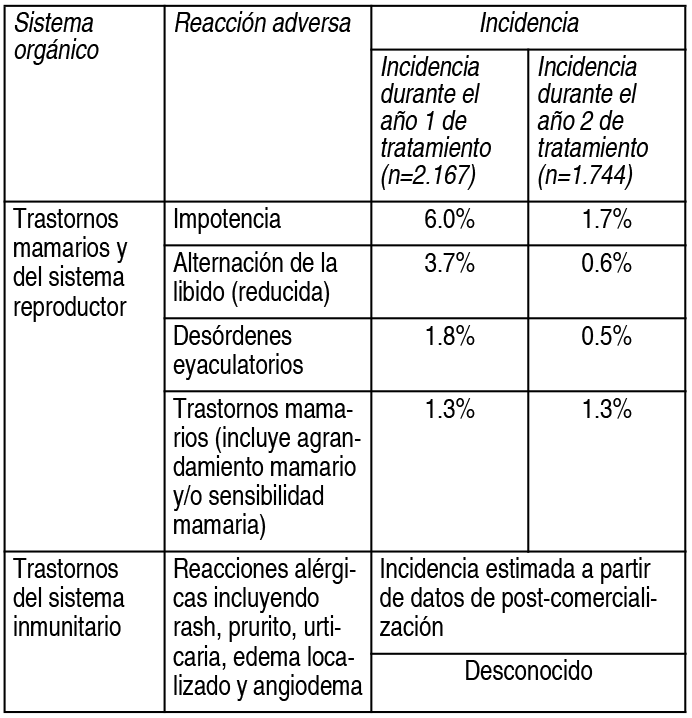 COMPOSICION: Cada comprimido contiene: Dutasterida 0.5 mg. Excipientes: Celulosa Microcristalina (Avicel PH101), Croscarmelosa Sódica, Lactosa Anhidra, Estearato de Magnesio. ACCION: Antiprostático. INDICACIONES: Tratamiento de los síntomas moderados a severos de la hiperplasia prostática benigna (HPB). Reducción del riesgo de retención urinaria aguda (RUA) y cirugía en pacientes con síntomas moderados a severos de HPB. Además, Tumulán en combinación con el alfa-bloqueante tamsulosina, trata y previene la progresión de la hiperplasia prostática benigna (HPB) reduciendo el tamaño de la próstata, aliviando los síntomas y mejorando el flujo urinario. DOSIS: Tumulán puede administrarse solo o en combinación con el alfa-bloqueante tamsulosina (0.4 mg). Adultos (incluyendo ancianos): La dosis recomendada de Tumulán es de 1 comprimido (0.5 mg) por vía oral 1 vez por día. Los comprimidos deben tragarse enteros y pueden tomarse con o sin alimentos. Aunque puede observarse una mejora en una primera etapa, puede llevar hasta 6 meses antes de lograr una respuesta al tratamiento. No es necesario ajuste de la dosis en los ancianos. Insuficiencia renal: No se ha estudiado el efecto de la insuficiencia renal sobre la farmacocinética de dutasterida. No se anticipa un ajuste en la dosificación para pacientes con insuficiencia renal. Insuficiencia hepática: No se ha estudiado el efecto de la insuficiencia hepática sobre la farmacocinética de dutasterida, de modo que debe tenerse cuidado en pacientes con insuficiencia hepática leve a moderada (ver Advertencias y Precauciones y Propiedades farmacocinéticas). En pacientes con insuficiencia hepática severa, está contraindicado el uso de dutasterida. CONTRAINDICACIONES: El uso de dutasterida está contraindicado en mujeres, niños y adolescentes (ver Embarazo y Lactancia). Dutasterida está contraindicado en pacientes con hipersensibilidad al dutasterida, otros inhibidores de la 5-α-reductasa, o a cualquiera de los excipientes. Dutasterida está contraindicado en pacientes con insuficiencia hepática severa. ADVERTENCIAS: Efectos en la detección del antígeno prostático específico (APE) y cáncer de próstata: Antes de indicarse el tratamiento con dutasterida debe realizarse examen digital rectal, como también otras evaluaciones para el cáncer de próstata, y a partir de entonces en forma periódica. No se estudió dutasterida en pacientes con enfermedad hepática. Debe tenerse cuidado al administrar dutasterida a pacientes con insuficiencia hepática leve a moderada (ver Posología, Contraindicaciones y Propiedades farmacocinéticas). La concentración sérica de antígeno prostático específico (APE) es un componente importante en la detección del cáncer de próstata. La dutasterida produce una reducción en los niveles promedio de APE en suero de aproximadamente un 50% después de 6 meses de tratamiento. Los pacientes tratados con Tumulán deben tener un nuevo valor basal de APE establecido luego de 6 meses de tratamiento con dutasterida. Se recomienda el monitoreo de los valores de APE regularmente en adelante. Cualquier aumento sostenido desde el nivel más bajo de APE mientras en tratamiento con Tumulán puede indicar la presencia de cáncer de próstata (principalmente cáncer de alto grado) o incumplimiento del tratamiento con dutasterida y debe ser evaluado cuidadosamente, incluso si esos valores se encuentran dentro del rango normal para hombres no tratados con inhibidores de la 5-α-reductasa. Los niveles totales de APE en suero vuelven a los valores basales, dentro de un lapso de 6 meses de discontinuar el tratamiento. La relación entre el APE libre y total permanece constante incluso bajo la influencia de dutasterida. Si los médicos eligen usar un porcentaje de APE libre como auxiliar en la detección de cáncer de próstata en hombres que siguen tratamiento con Tumulan, no resulta necesario un ajuste a este valor. EFECTOS: La siguiente tabla muestra las reacciones adversas: Ver Tabla PRECAUCIONES: Embarazo y lactancia: Tumulán está contraindicado en las mujeres. Como ocurre con otros inhibidores de 5-α-reductasa, dutasterida inhibe la transformación de testosterona en dihidrotestosterona y puede, si se administra a mujeres embazadas de fetos varones, inhibir el desarrollo de los genitales externos del feto (ver Advertencias). Se han recuperado pequeñas cantidades de dutasterida del semen de sujetos que recibían 0.5 mg de dutasterida por día. En base a estudios realizados en animales, en improbable que un feto masculino sea afectado de manera adversa si su madre se expone al semen de un paciente tratado con dutasterida (cuyo riesgo es mayor durante las primeras 16 semanas de embarazo). Sin embargo, como ocurre con todos los inhibidores de 5-α-reductasa, cuando la pareja de un paciente está, o potencialmente podría estar embarazada, se recomienda que el paciente evite la exposición de su pareja al semen mediante el uso de un preservativo. Se desconoce si dutasterida se excreta en la leche materna. Fertilidad: Se ha informado que dutasterida afecta las características del semen (reducción en el recuento de espermatozoides, el volumen seminal y la motilidad de espermatozoides) en hombres sanos (ver Propiedades farmacodinámicas). La posibilidad de reducción de la fertilidad masculina no puede ser descartada. Efectos sobre la capacidad de conducir y usar máquinas: En base a las propiedades farmacocinéticas de dutasterida, el tratamiento con dutasterida no debería interferir con la capacidad de conducir u operar maquinarias. INTERACCIONES: Efectos de otros fármacos sobre la farmacocinética de dutasterida: Uso con inhibidores de CYP3A4 y/o P-glicoproteína: La dutasterida es extensamente metabolizada. Los estudios in vitro indican que este metabolismo es catalizado por CYP3A4 y CYP3A5. No se han realizado estudios formales de interacción con potentes inhibidores del CYP3A4. Sin embargo, en un e