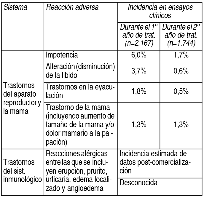 COMPOSICION: Cada cápsula contiene: Dutasteride 0.5 mg. Excipientes: Crospovidona, Povidona, Dióxido de Silicio Coloidal, Almidón Pregelatinizado, Estearato de Magnesio, Lactosa Monohidratada, c.s. ACCION: Inhibidor de la 5-α-reductasa de testosterona. Código ATC: G04CB02. INDICACIONES: Tratamiento de los síntomas moderados a graves de la hiperplasia benigna de próstata (HBP). Reducción del riesgo de retención aguda de orina (RAO) y de cirugía en pacientes con síntomas moderados a graves de HBP. DOSIS: La dosis recomendada de Urocont es de 1 cápsula (0.5 mg) 1 vez al día, administrada por vía oral. Aunque se puede observar una mejoría luego de las primeras tomas, puede tardar hasta 6 meses en alcanzar una respuesta máxima al tratamiento. Método de administración: Las cápsulas deben tragarse enteras y no masticarse o abrirse, ya que el contacto con el contenido de la cápsula puede provocar irritación de la mucosa orofaríngea. Las cápsulas se pueden tomar con o sin alimentos. Poblaciones especiales: Insuficiencia renal: No se ha estudiado el efecto que puede ejercer la insuficiencia renal en la farmacocinética de dutasteride. No se prevé que sea necesario el ajuste de dosis en pacientes con insuficiencia renal. Insuficiencia hepática: No se ha estudiado el efecto que pueda ejercer la insuficiencia hepática en la farmacocinética de dutasteride, por lo que se debe utilizar con cuidado en pacientes con insuficiencia hepática leve a moderada. La utilización de dutasteride está contraindicada en pacientes con insuficiencia hepática grave. Pacientes de edad avanzada: No se requiere ningún ajuste posológico en pacientes de edad avanzada. CONTRAINDICACIONES: Hipersensibilidad a dutasteride, a otros inhibidores de la 5-α-reductasa, o a alguno de los excipientes. Mujeres, niños y adolescentes. Insuficiencia hepática grave. EFECTOS: Aproximadamente el 19% de los 2167 pacientes que han recibido dutasteride durante 2 años en los ensayos clínicos de fase III controlados con placebo, han desarrollado reacciones adversas durante el primer año de tratamiento. La mayoría de estos eventos fueron de leves a moderados y se observaron en el aparato reproductor. La siguiente tabla muestra las reacciones adversas encontradas en ensayos clínicos controlados, así como en la experiencia post-comercialización. Las reacciones adversas de los ensayos clínicos a juicio del investigador (con una incidencia igual o superior al 1%) se han notificado con una incidencia superior que en los grupos placebo durante el primer año de tratamiento. Los acontecimientos adversos que han ocurrido tras la comercialización, se identificaron a partir de notificaciones espontáneas post-comercialización, por lo que la incidencia real es desconocida: Ver Tabla PRECAUCIONES: En los pacientes con HBP debe realizarse un tacto rectal así como otros métodos de evaluación de cáncer de próstata antes de iniciar tratamiento con dutasteride y posteriormente de forma periódica. El uso de dutasteride se ha asociado con un aumento en la incidencia de cuadros de cáncer de próstata de alto grado (Gleason 8-10). Cualquier aumento confirmado en los niveles de PSA, pueden señalar la presencia de cáncer de próstata y se debe evaluar con cuidado, incluso si esos valores se encuentran dentro del rango normal para los hombres que no se encuentran en tratamiento con un inhibidor de la 5-α-reductasa. Dutasteride se absorbe a través de la piel, por lo tanto, las mujeres, los niños y los adolescentes deben evitar el contacto con cápsulas rotas. Si tiene contacto con cápsulas rotas, se debe lavar inmediatamente la zona afectada con agua y jabón. Dutasteride no se ha estudiado en pacientes con insuficiencia hepática. Se debe tener cuidado con su administración en pacientes con insuficiencia hepática leve a moderada. La concentración de antígeno prostático específico en suero (PSA) es un componente importante de la detección del cáncer de próstata. Generalmente, una concentración total de PSA en suero mayor que 4 ng/ml requiere evaluación adicional y considerar la posibilidad de realizar una biopsia de próstata. Los médicos deben conocer que un valor basal de PSA menor que 4 ng/ml en pacientes tratados con dutasteride no excluye un diagnóstico de cáncer de próstata. Dutasteride provoca una disminución de los niveles de PSA en suero de aproximadamente un 50%, después de 6 meses, en pacientes con HBP, incluso en presencia de cáncer de próstata. Aunque puede haber variaciones individuales, la reducción de aproximadamente un 50% de los niveles de PSA es previsible tal y como se ha observado durante todo el intervalo de valores basales de PSA de 1.5 a 10 ng/ml. Por lo tanto, para interpretar un valor aislado de PSA en un hombre tratado con dutasteride durante 6 meses o más, se deben doblar los valores de PSA para poder compararlos con los valores normales en hombres no tratados. Este ajuste no afecta a la sensibilidad y especificidad del análisis de PSA y mantiene su capacidad para detectar el cáncer de próstata. Cualquier aumento sostenido en los niveles de PSA durante el tratamiento con dutasteride se debe evaluar cuidadosamente, incluyendo la posibilidad de un incumplimiento del tratamiento con el mismo. Los niveles totales de PSA en suero vuelven al estado basal en el plazo de 6 meses desde la suspensión del tratamiento. La razón entre el PSA libre y el total permanece constante incluso bajo el tratamiento con dutasteride. Si los médicos eligen utilizar el porcentaje de PSA libre como ayuda en la detección del cáncer de próstata en hombres en tratamiento con dutasteride, no parece necesario realizar ningún ajuste en su valor. Embarazo y lactancia: La utilización de dutasteride está contraindicada en mujeres embarazadas. Al igual que el resto de los inhibidores de la 5-α-reductasa, dutasteride inhibe la conversión de testosterona a dihidrotestosterona y puede, si se ad