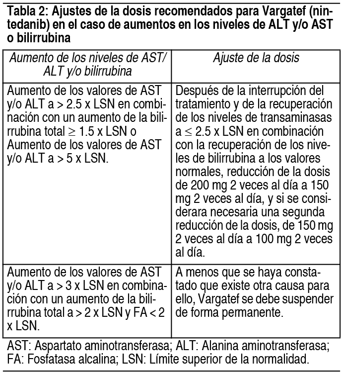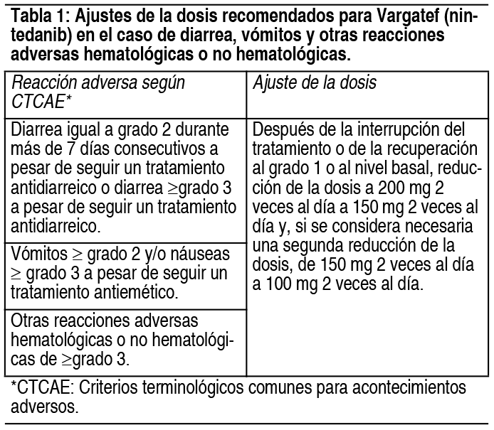 COMPOSICION: Concentración 100 mg: Cada cápsula blanda contiene: Nintedanib 100 mg (equivalente a 120.4 mg de Nintedanib etanosulfonato). Excipientes c.s. Concentración 150 mg: Cada cápsula blanda contiene: Nintedanib 150 mg (equivalente a 180.6 mg de Nintedanib etanosulfonato). Excipientes c.s. ACCION: Agente antineoplásico. Inhibidor de la proteína tirosinquinasa. INDICACIONES: Vargatef® está indicado en combinación con docetaxel para el tratamiento de los pacientes con cáncer pulmonar no microcítico (non-small cell lung cancer, NSCLC, por su sigla en inglés) localmente avanzado, metastásico o recurrente con histología tumoral de adenocarcinoma tras la quimioterapia de primera línea. DOSIS: El tratamiento con Vargatef® debe ser iniciado y supervisado por un médico con experiencia en el uso de terapias oncológicas. Para obtener información sobre la posología, el modo de administración y las modificaciones de la dosis de docetaxel, sírvase consultar la información del producto correspondiente de docetaxel. La dosis recomendada de Vargatef® es 200 mg 2 veces al día con un intervalo de aproximadamente 12 horas entre sí, en los días 2 a 21 de un ciclo de tratamiento estándar de docetaxel de 21 días. Vargatef® no debe ser administrado el mismo día de la administración de la quimioterapia de docetaxel (= día 1). Las cápsulas de Vargatef® deben tomarse con alimentos, deben tragarse enteras con agua y no deben masticarse ni triturarse. En el caso de omitirse una dosis de Vargatef®, la administración debe reanudarse en el siguiente momento programado según la dosis recomendada. No deben incrementarse las dosis diarias individuales de Vargatef® por sobre la dosis recomendada para compensar dosis omitidas. No debe excederse la dosis diaria máxima recomendada de 400 mg. Tras la discontinuación del docetaxel, los pacientes pueden continuar el tratamiento con Vargatef® mientras se observe un beneficio clínico o bien hasta que se produzca una toxicidad inaceptable. Ajustes de la dosis: Como medida inicial para el manejo de las reacciones adversas (ver Tabla 1 y 2), el tratamiento con Vargatef® debe suspenderse temporariamente hasta que la reacción adversa específica se haya resuelto a un nivel que permita la continuación del tratamiento a grado 1 o al valor basal. El tratamiento con Vargatef® puede reanudarse en una dosis menor. Se recomienda realizar ajustes escalonados de la dosis a razón de 100 mg por día (es decir, una reducción de 50 mg por cada toma diaria) sobre la base del perfil individual de seguridad y tolerabilidad del paciente, según se describe en las Tabla 1 y Tabla 2. En el caso de que la(s) reacción(es) adversa(s) persista(n), es decir, si el paciente no tolera el régimen de dos tomas diarias de 100 mg cada una, deberá interrumpirse definitivamente el tratamiento con Vargatef®. Si se producen aumentos específicos de los valores de aspartato aminotransferasa (AST) / alanina aminotransferasa (ALT) a > 3 x del límite superior de la normalidad (LSN) en combinación con un aumento de la bilirrubina total a ≥ 2 x LSN y de la fosfatasa alcalina (FA) < 2 x LSN (ver Tabla 2), el tratamiento con Vargatef® se debe interrumpir. A menos que se haya constatado que existe otra causa para ello, Vargatef® se debe suspender de forma permanente. Ver Tabla Ver Tabla Poblaciones especiales: Población pediátrica: La seguridad y la eficacia de Vargatef® en pacientes pediátricos no han sido estudiadas en estudios clínicos. Pacientes de edad avanzada (≥ 65 años): No se observaron diferencias en general en lo que respecta a la seguridad y la eficacia en los pacientes de edad avanzada en comparación con los pacientes menores de 65 años de edad. No se requieren ajustes de dosis sobre la base de la edad del paciente. Raza y peso corporal: Sobre la base de los análisis de farmacocinética poblacional, no se requiere a priori ningún ajuste de la dosis de Vargatef®. Insuficiencia renal: Menos del 1% de una dosis única de nintedanib se excreta a través de los riñones. No se requiere un ajuste de la dosis inicial en los pacientes con insuficiencia renal leve a moderada. La seguridad, la eficacia y la farmacocinética de nintedanib no han sido estudiadas en pacientes con insuficiencia renal severa (índice de depuración de creatinina CrCL < 30 ml/min). Insuficiencia hepática: Nintedanib se elimina primordialmente a través de la excreción por vía biliar/fecal (>90%). La exposición aumentó en pacientes con insuficiencia hepática (Child Pugh A, Child Pugh B). No se requiere ningún ajuste de la dosis inicial para los pacientes con insuficiencia hepática leve sobre la base de los datos clínicos disponibles (Child Pugh A). La seguridad y la eficacia de nintedanib no han sido investigadas en pacientes con insuficiencia hepática clasificada como Child Pugh B o C. No se recomienda el tratamiento con Vargatef® en los pacientes con insuficiencia hepática moderada (Child Pugh B) o severa (Child Pugh C). PRESENTACIONES: Envases con 60 (Vargatef® 150 mg) y 120 (Vargatef® 100 mg) cápsulas blandas. Nota: Para acceso a la información de prescripción médica completa consulte el último prospecto aprobado. Por cualquier consulta puede contactarse con Boehringer Ingelheim al teléfono (011)-4704-8600. |